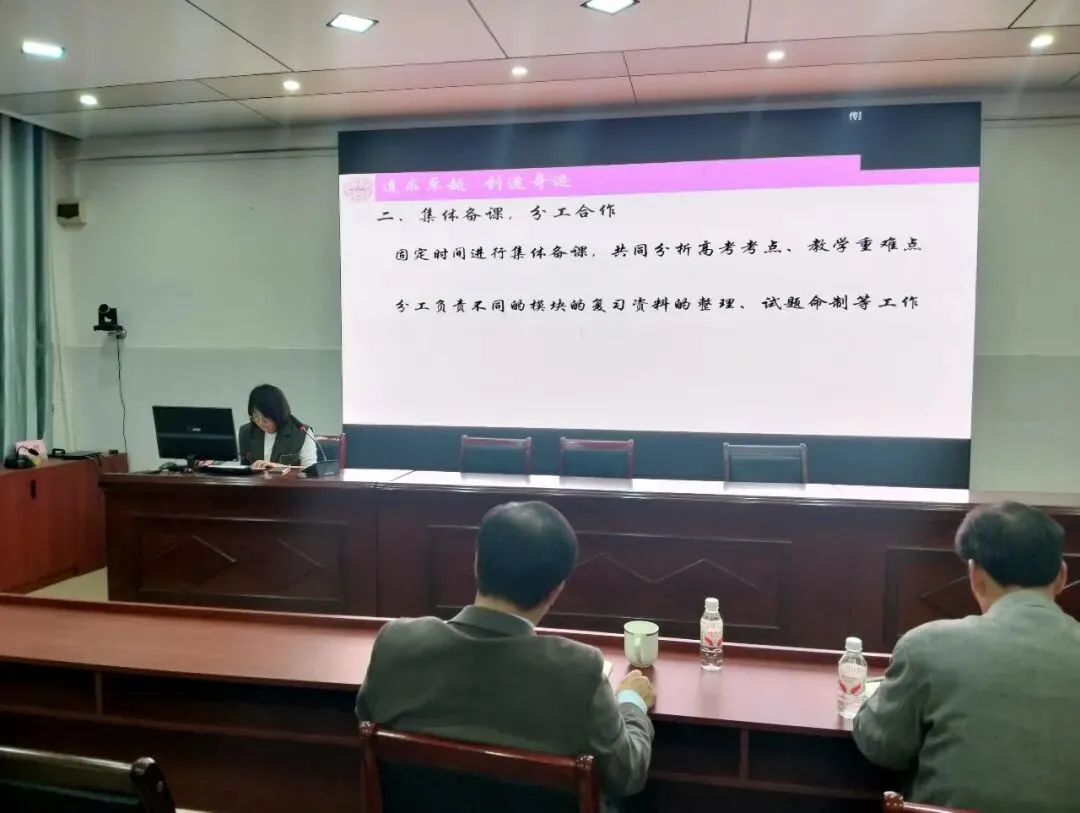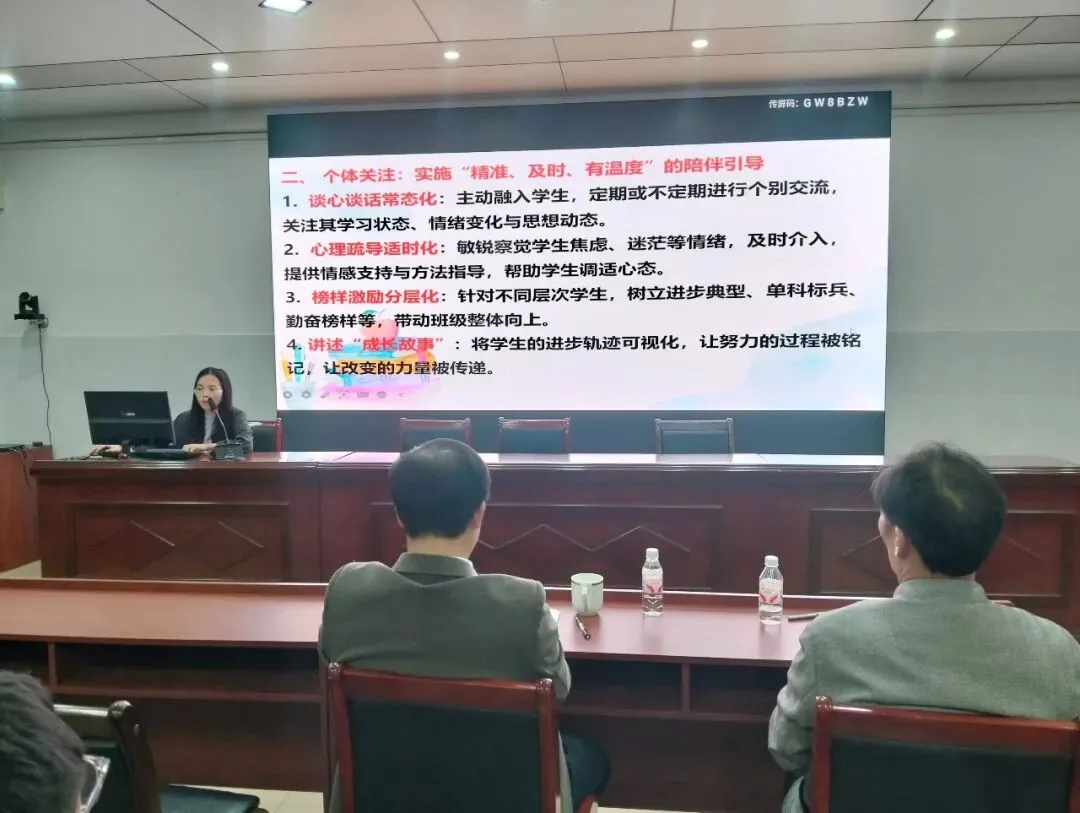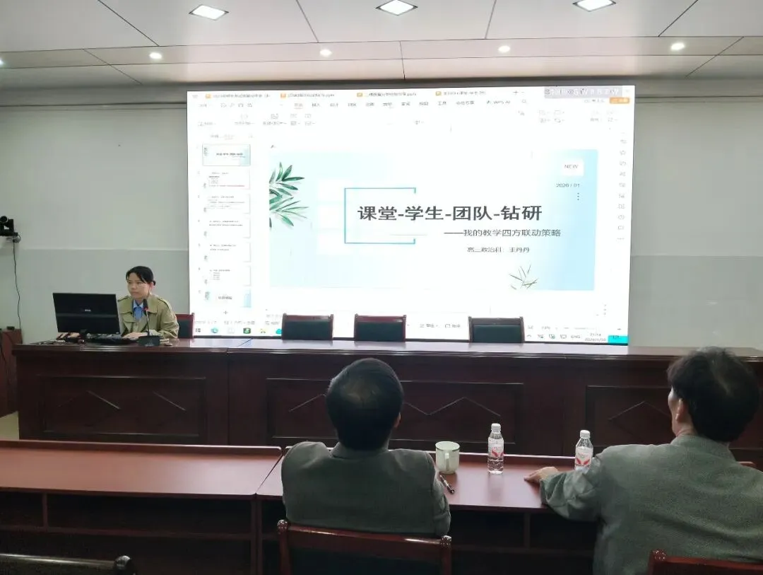 随后,经验分享环节干货满满。化学基组长杨镇凤结合学科特点,从备课教研、课堂效率提升、培优补弱策略等方面分享了高三化学教学的实践经验,为其他学科提供了有益借鉴。优秀班主任彭小妹聚焦班级管理与学情把控,围绕如何激发学生学习动力、关注学生心理状态、搭建家校沟通桥梁等内容展开分享,干货十足。政治教师王丹丹以《课堂-学生-团队-钻研:我的教学四方联动策略》为题,深入阐述了如何通过优化课堂设计、关注学生主体地位、强化团队协作、深耕教学研究的联动模式提升教学质量,引发在场教师共鸣。