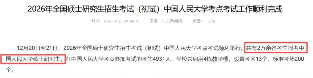 2026年,共有2万余名考生报考中国人民大学硕士研究生,人文社科领域的顶尖实力,让该校在相关专业的竞争中尤为激烈。