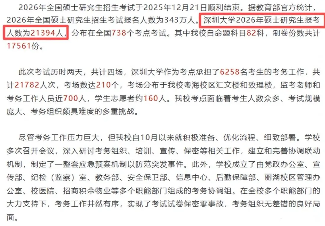 2026年深圳大学硕士研究生报考人数为21394人,依托粤港澳大湾区的区位优势与快速发展的学科建设,成为近年来热度飙升的新兴热门院校。
