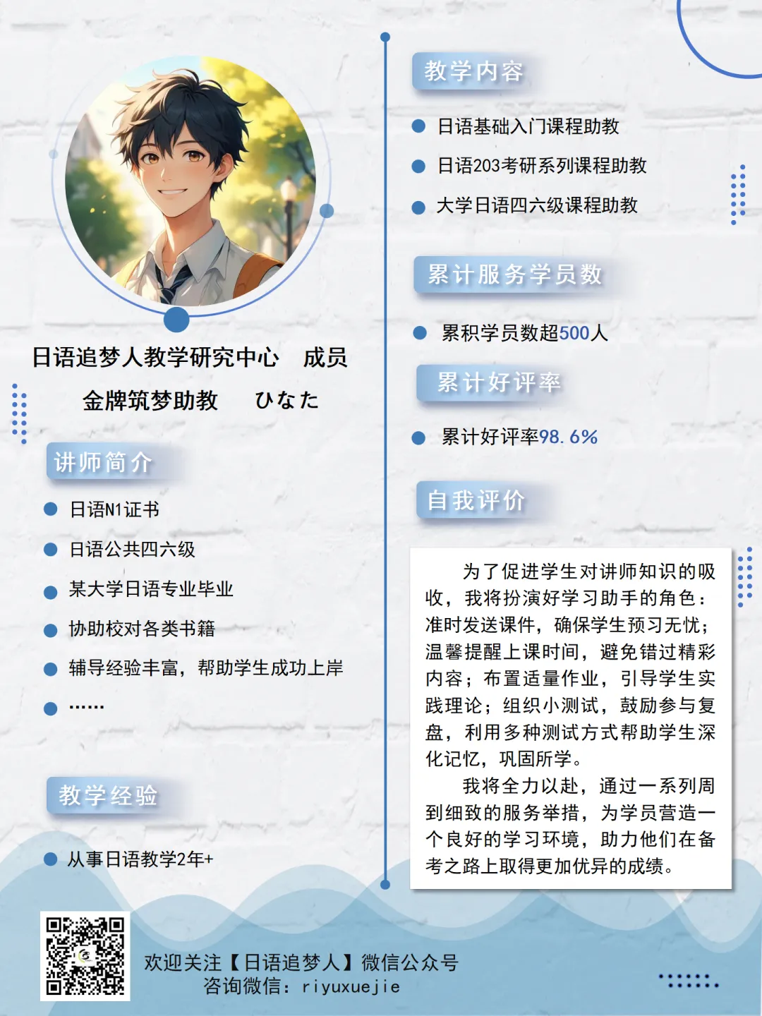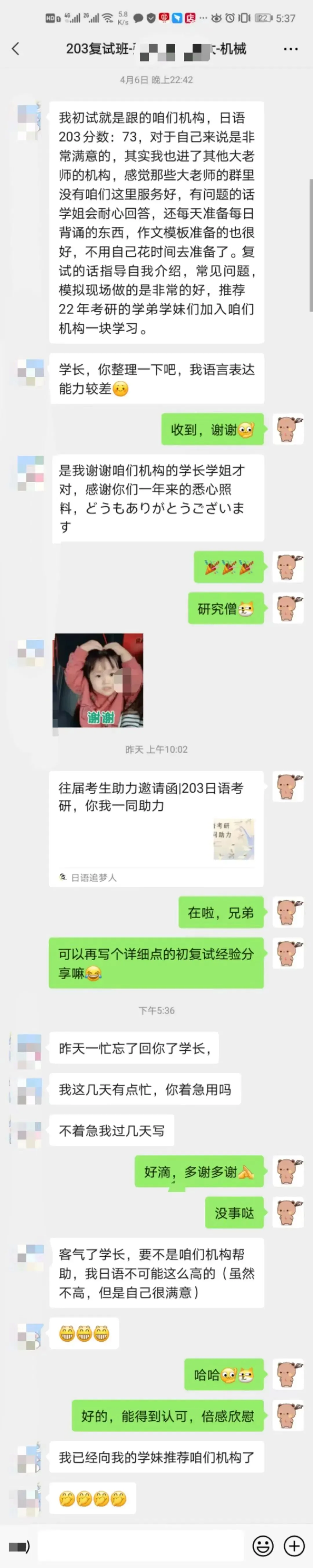 针对203日语辅导,本机构已有三年有余,通过初复试辅导助力不少于1000名日语学子成功上岸,自此过程中,我们总结了大量复试案例,分析了各类考研高校,批改修正了上百所高校的自我介绍案卷,可谓是经验丰富,战果丰硕。