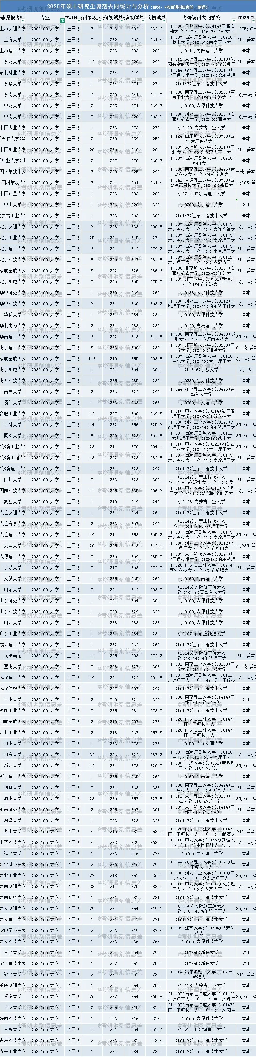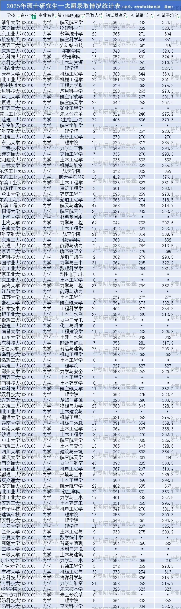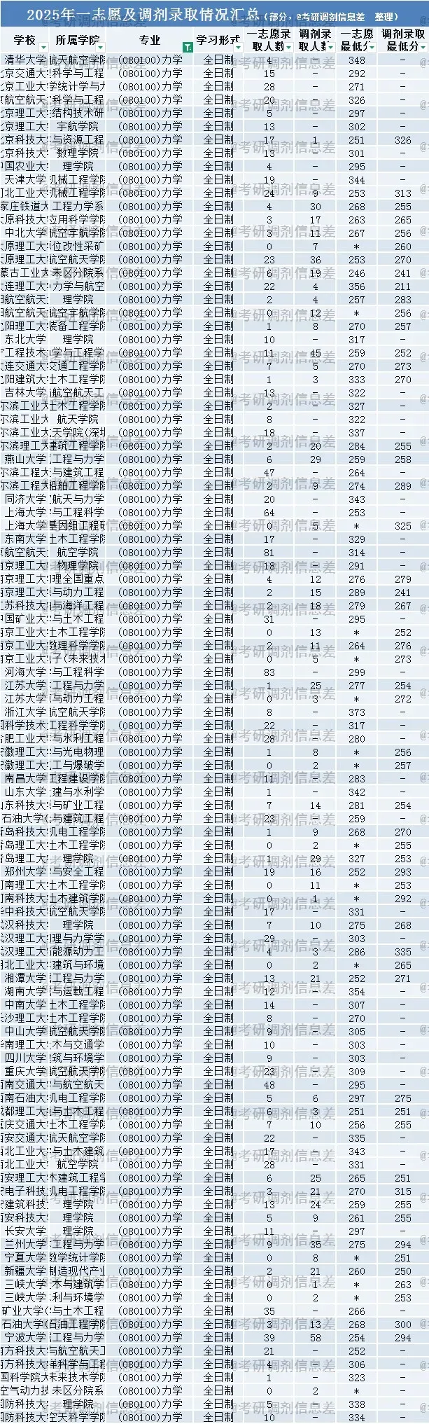1️⃣ 受2025年考研总人数下降📉50万影响,多数专业一志愿报考人数减少,调剂名额相应增多,力学专业亦不例外。2025年,该专业一共有83所院校招生,其中46所接受考研调剂,共录取调剂生742人。热门院校如河海大学,一志愿录取83人,一志愿录取最低分299分,未接收考研调剂。各院校具体录取情况见下图(部分展示),部分院校出现“一志愿录取人数少于考研调剂录取人数”“一志愿最低分高于调剂最低分”:南京航空航天大学,录取81人,录取最低分314分;