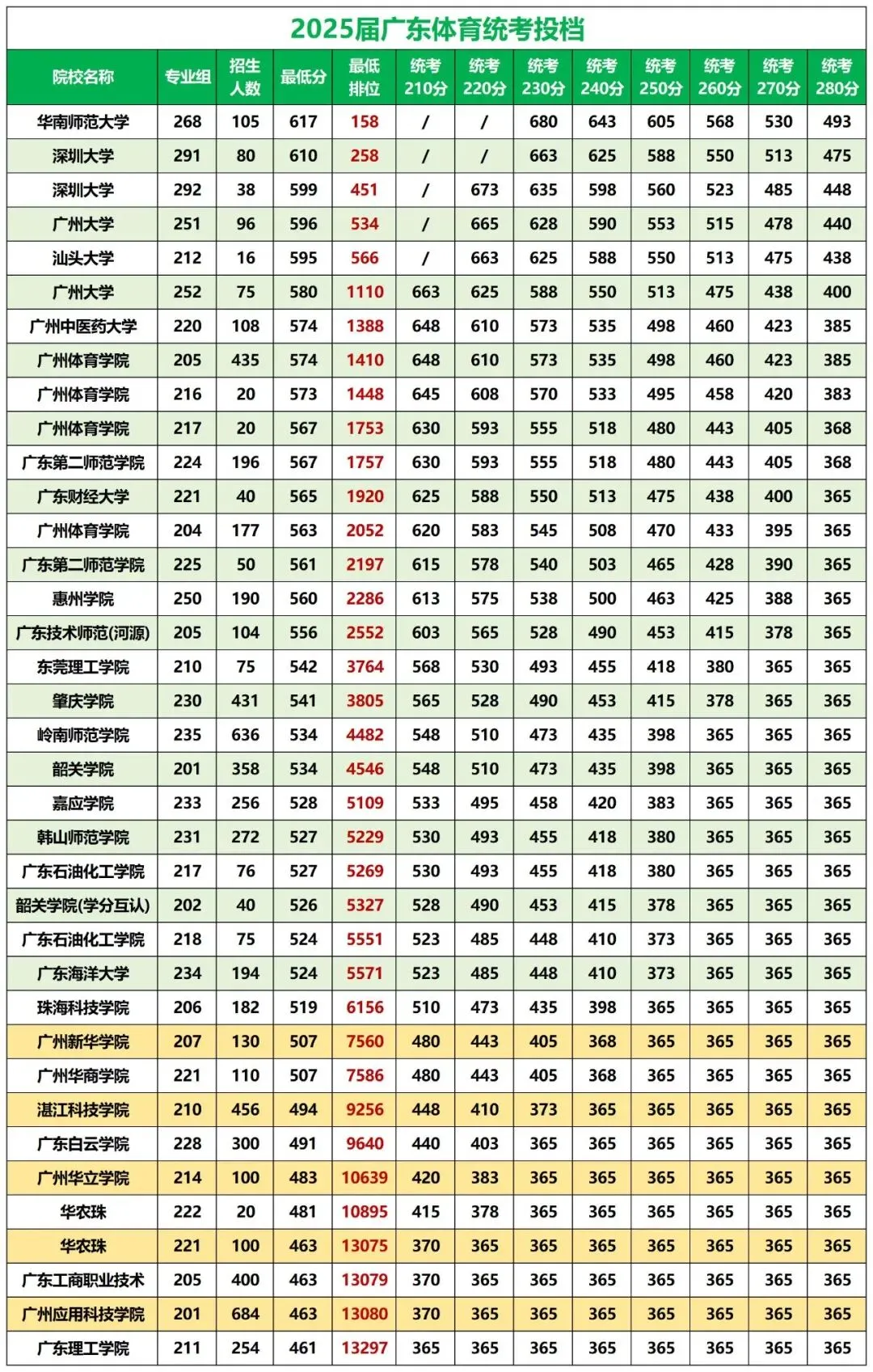 侨升教育独家整理2025届广东体育统考投档详情,覆盖华南师范大学、深圳大学、广东第二师范学院等30+院校,从招生人数到最低分/排位,再到不同统考分数段(210-280分)的适配院校,一目了然!