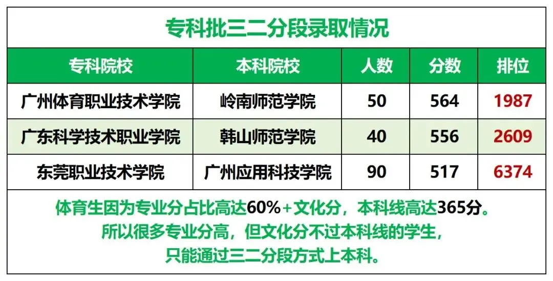 三二分段“弯道超车”:广州体育职业技术学院(专科)对接岭南师范学院(本科),仅招50人却要564分(排位1987),比本科批排位高2600+!广东科学技术职业学院对接韩山师院,40人录满需556分(排位2609),同样高于本科批。