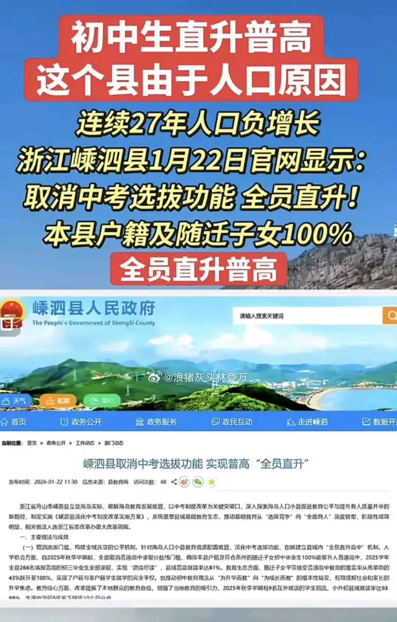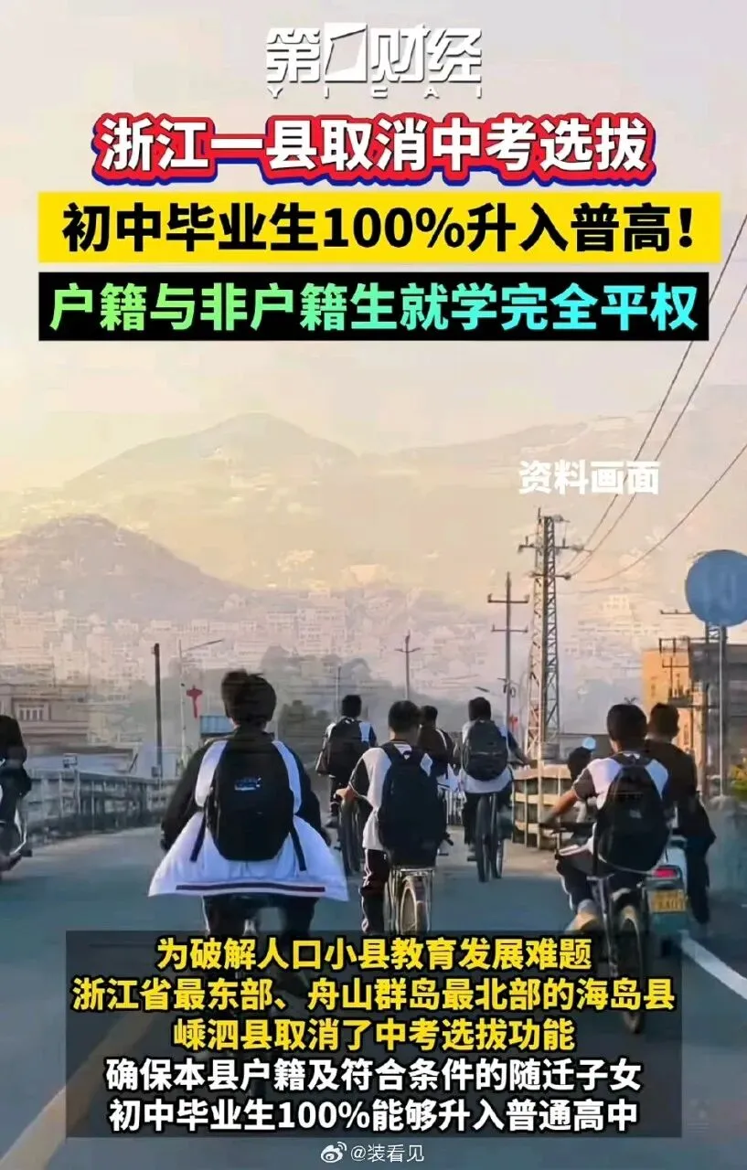 浙江舟山市嵊泗县成为全国首个官宣"全员直升高中"的县域,2025年秋季起全面取消中考选拔功能,全县266名填报普高的初三毕业生100%升入普通高中。