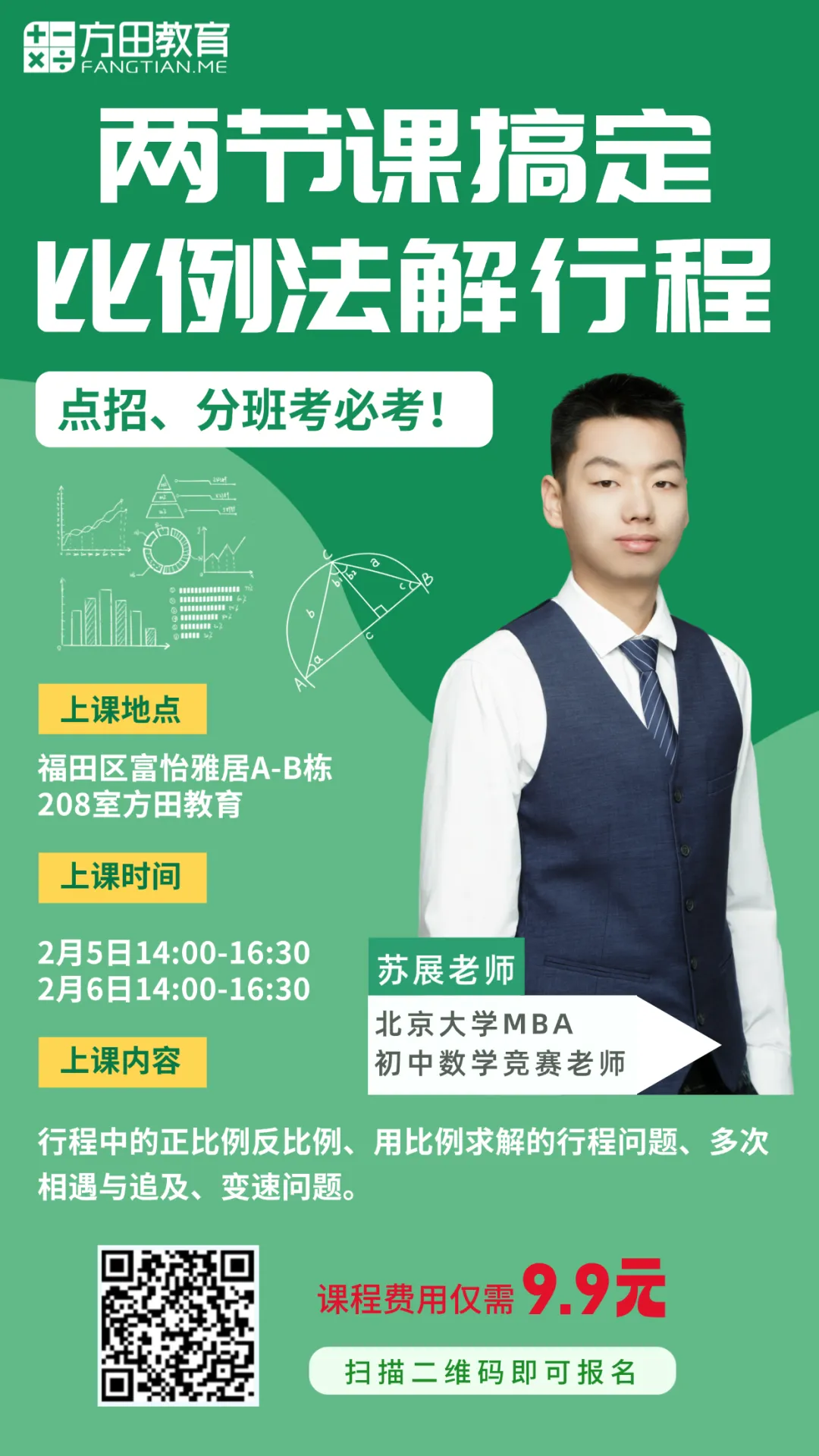 为了帮助各位小升初的家长去准备开学后的FBK和升学季的DZ考试,苏老师还准备开展一个【两节课搞定比例法解行程】的短期班,去应对在FBK和DZ考试中必考的知识点!家长可以直接扫码报名!