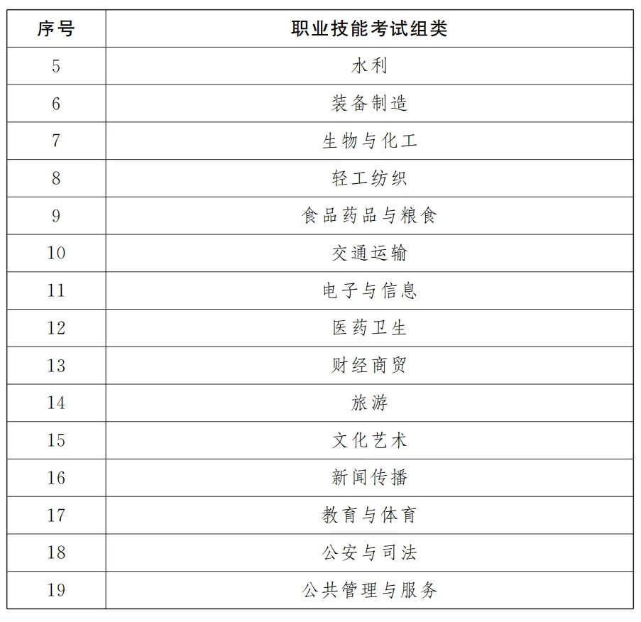 根据《职业教育专业目录》,将职业技能考试划分为19个组类,对应19个专业大类。