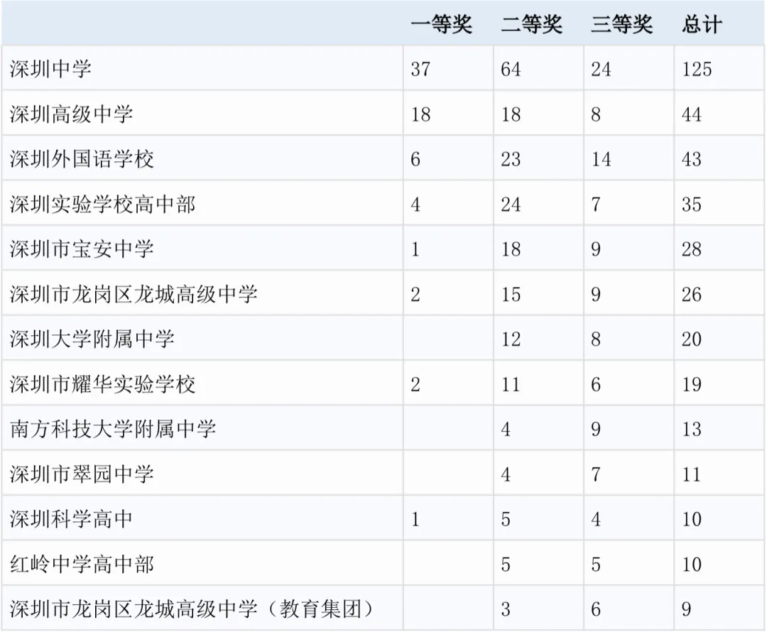 深圳作为教育高地,在赛事中表现亮眼。2025年初赛,深圳斩获73个一等奖,占全省一等奖总数的18.1%。深圳中学更是以 37个一等奖的成绩领跑全市,展现超强竞赛实力。