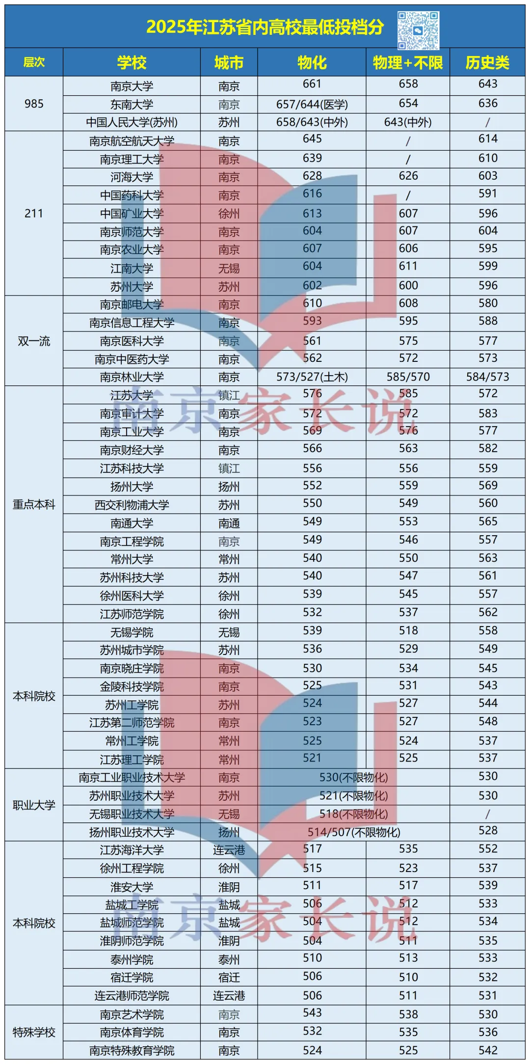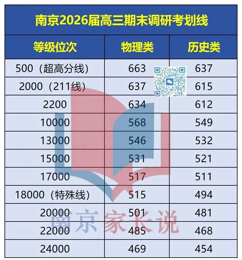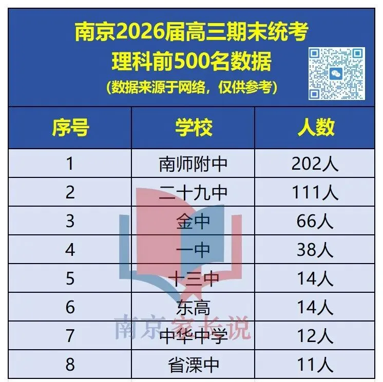 从具体分数可以清楚看到,一个毋庸置疑的结论是:本次“一模”的各层次分数线几乎实现了对“零模”的全线上涨。这并非某个批次的偶然现象,而是一个普遍趋势。昨天,网络上也流传出南京各高中高三模考理科前500名的情况,南师附中遥遥领先,模考王二十九中再发力,人数超过金中,一起来看数据!据悉,本次期末调研考理科最高分来自金中,705分;附中理科681分排名21名,644分排名374名;29中理科680分排名21名,644分排名222名。那么,一模出分后,该如何去对标省内院校呢?小编汇总了2025年省内高校投档线统计表,方便家长们对应目标院校。如果您实在不知道该如何定位目标院校,也可以扫描下方的二维码,填写孩子本次模考成绩,即可获取全省排名换算和院校推荐!南京高三一模将在3月19日—20日开考,与盐城联考,全市统改,孩子们要利用寒假,好好准备哦~适合人群:六-初三年级学生、家长