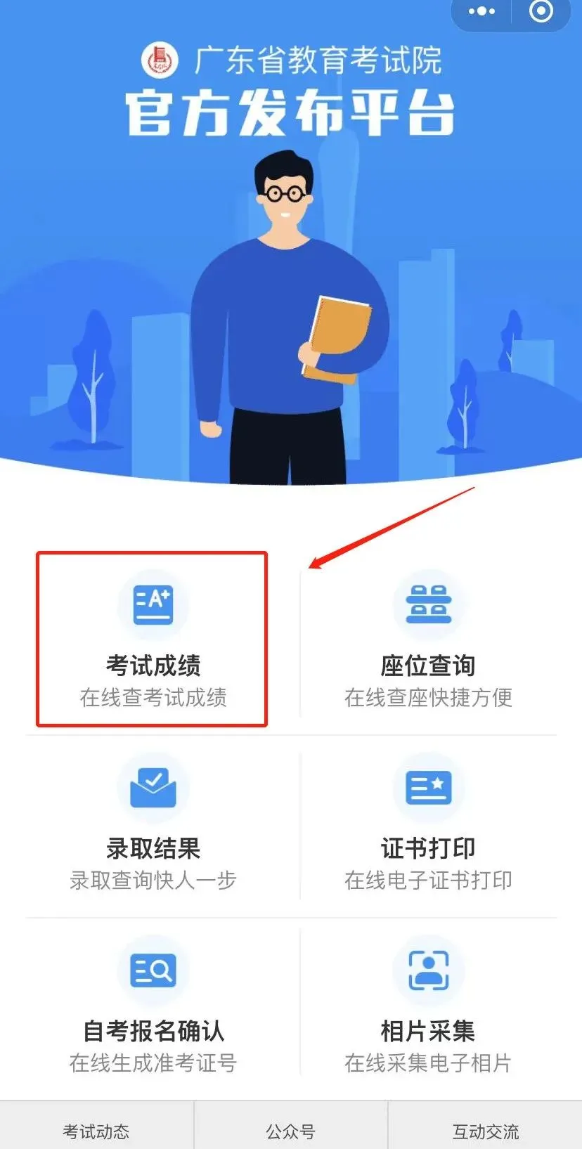 ②进入考试院官方小程序,点击【考试成绩】-【高中学考】