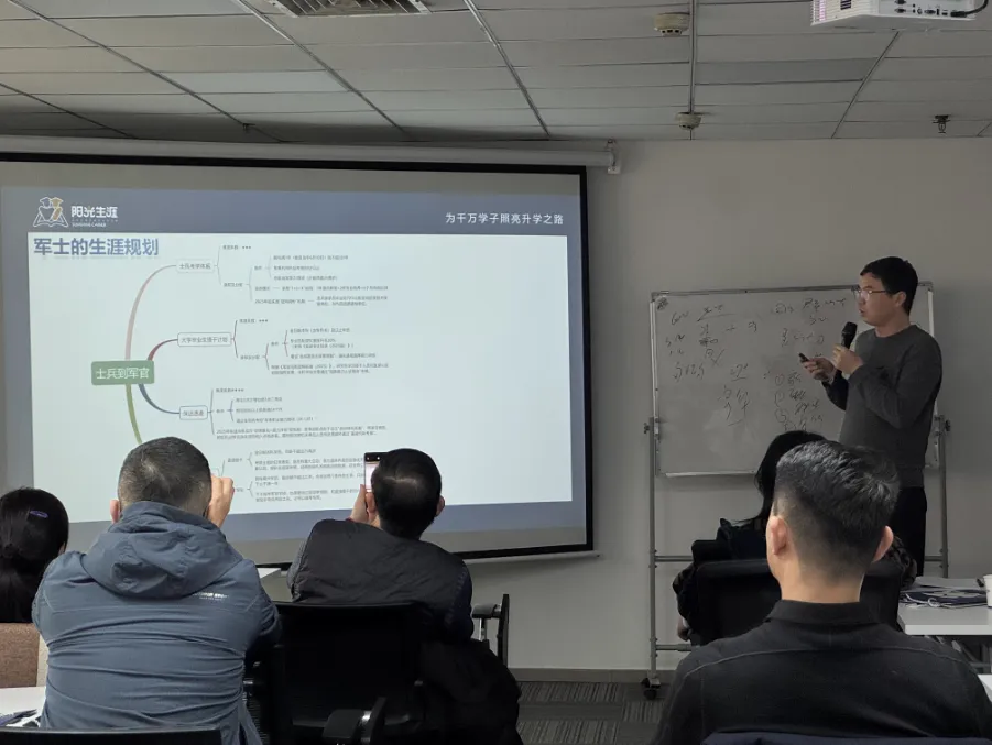 多元升学路径解读环节,是本次培训的亮点之一。位鑫鑫老师重点围绕军校、定向军士、公安警校、司法警校四大热门报考方向,不仅细致拆解各方向的报考条件、政策要求、院校选择技巧及就业前景,更深入详解其核心成长路径与晋升渠道,助力学员全面掌握这类特色升学方向的服务能力。其中,针对军校,详解其入学待遇、毕业后军衔授予及部队晋升体系;针对定向军士,拆解军地联合培养模式、入伍后的薪资待遇与长期发展路径;针对警校、司法院校,清晰梳理联考通关要点、入职后的岗位晋升逻辑与职业发展方向,打破业务局限,助力规划师打造“全品类、全方位”的升学规划服务能力,满足不同考生的多元升学需求,彰显阳光生涯“人皆有才 人无全才 科学规划 皆可成才”的品牌理念。