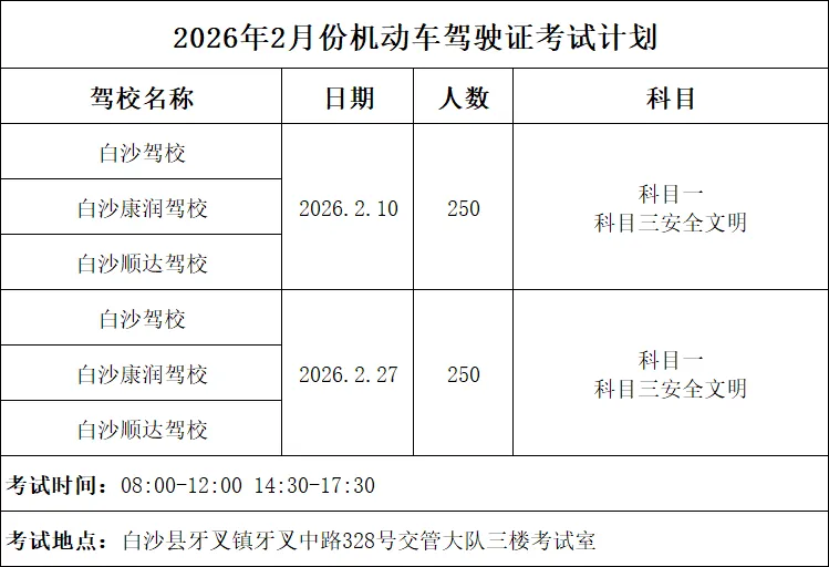 为进一步加强机动车驾驶人培训考试的监管力度,方便驾驶证考试学员了解考试安排,现公布白沙县2026年2月份机动车驾驶证考试计划。(报名摩托车驾驶证的人员均可参与)