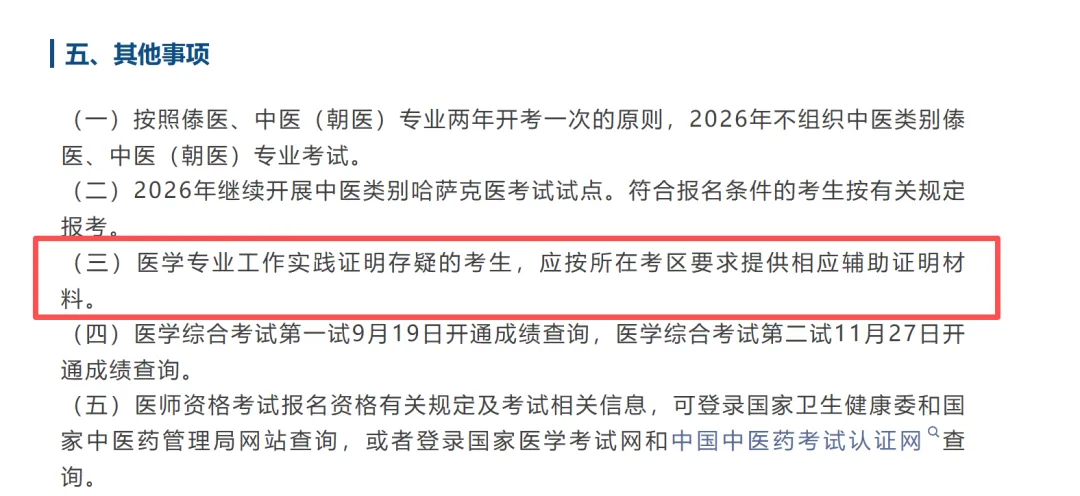 固定、透明的成绩公布时间体现了考试组织的规范性和对考生权益的尊重,增强考生对考试公平性的信任,体现了考试组织方的人性化设计,有助于医疗人才队伍的稳定建设和专业发展。所以哦,同学们,成绩公布的这天,期待大家收到的都是好学习!以下是网报和现场审核的补充说明,来自(2026考生手册)报名流程医师资格考试报名包括网上报名和现场审核两个部分。 为确保报名成功, 请务必仔细阅读以下报名流程并完成所有步骤。网报开通前, 考生应先在国家医学考试网进行个人信息注册并完成学信网学历验证。1.考生登陆国家医学考试网(http://www.nmec.org.cn/), 点击“考生服务”, 进入考生服务系统进行注册及报名。 已注册的考生也可使用国家医学考试中心微信小程序快速报名(微信搜索“国家医学考试中心” 小程序)。2. 考生网上报名前应知悉《国家医学考试网用户隐私政策》《国家医学考试网用户服务协议》,未注册考生点击“注册” 按钮进行网上注册。 注册成功后完成微信绑定, 注册用户名可用于国家医学考试中心开放的所有考试报名, 还用于打印准考证和查询成绩等考试服务。注册成功后, 该用户名不能更改, 考生须牢记用户名和密码。 报名过程中密码遗失的可通过邮箱方式找回。 如果找回密码失败, 请联系报名地所在考点工作人员协助解决。3. 用上一步骤中绑定的微信扫码登录考生服务系统完善“个人信息” 中相关内容。填写个人信息应真实、 准确、 有效, 不得自行添加标点符号或空格, 否则会导致报名失败; 所填个人信息将用于医师资格考试和考后数据分析报告、 医师执业注册, 请务必认真填写。5. 报名成功后, 打印《医师资格考试网上报名成功通知单》 (如报名成功后有信息修改,须重新提交并重新打印报名成功通知单, 原网上报名成功通知单无效) 。网报日期截止前, 考生可使用已绑定的微信扫码登录“国家医学考试服务平台” 查询、 修改报名信息。特别提醒:如需修改报名信息, 需在原报名信息处点击“重新报考”, 同时原报名信息被删除。 新的信息重新填报后, 须及时提交。 如未提交, 视为报名不成功(即打印不了新的通知单)。 提交成功后方能重新打印《医师资格考试网上报名成功通知单》, 原《医师资格考试网上报名成功通知单》 无效。步骤 1: 考生持规定报名材料, 到所在地考点进行现场审核, 具体审核时间、 地点及要求以考点通知为准。步骤 2: 现场审核通过的考生, 须在《医师资格考试报名暨授予医师资格申请表》 上签字确认, 报名信息一经确认不得更改。考生须按考点的通知要求缴纳考试费用。注: 参加线上辅助审核应用的考区, 考生请按考区、 考点要求真实、 准确提供资格审核材料。网报前未完成学信网学历验证的考生, 可继续在资格审核阶段完成学历验证。现场审核具体要求(湖南常德为例,大家可以了解,具体一定要关注当地考区卫健委官方通知) 资格审核方式