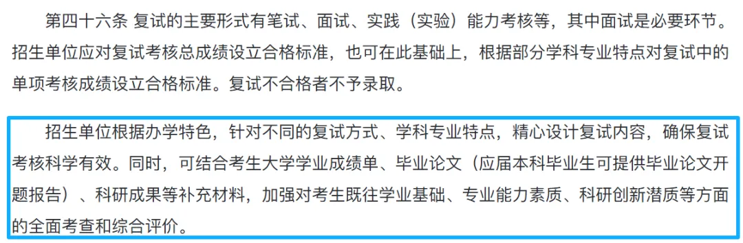 考查重点从传统的分数导向进一步拓展至既往学业基础、专业能力素养、科研创新潜质三大维度!复试评价不再“一考定音”,而是走向过程性与综合性评价。