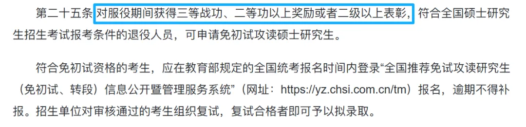 与加分政策收紧形成对比的是,免初试政策范围有所扩大。以往只有在部队荣立二等功以上的退役人员才具备免初试资格,今年政策放宽,新增服役期间获得三等战功的退役人员,同样可申请免初试攻读硕士研究生。