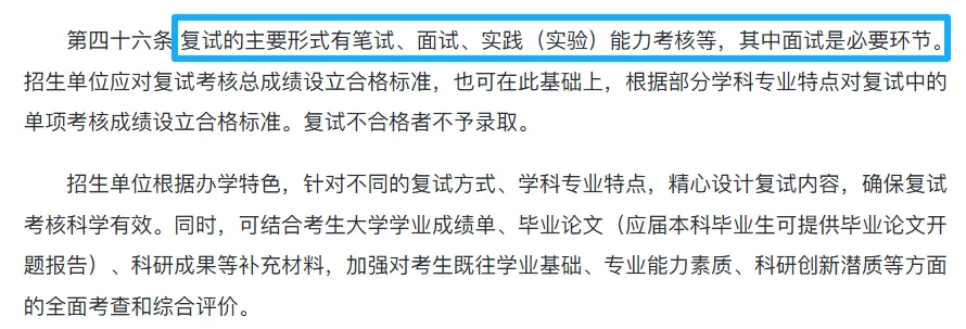 新规首次明确:面试是复试的必要环节。这意味着部分院校可能逐步取消复试笔试,“面试+实践考核”或将成为主流模式。此前已有两所医学院校官宣取消复试笔试环节。