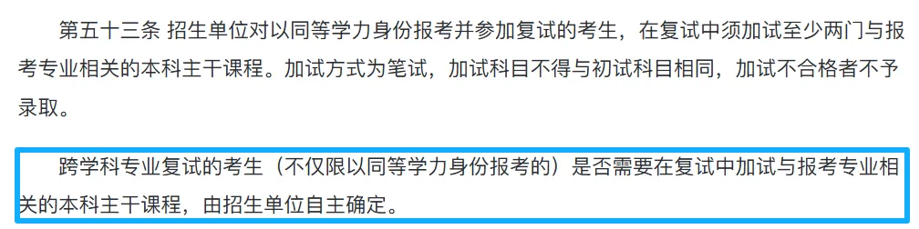 对于跨学科专业报考的考生,新规给予了招生单位明确的授权,招生单位可进行笔试加试,加试科目不得与初试科目相同,加试不合格者不予录取。