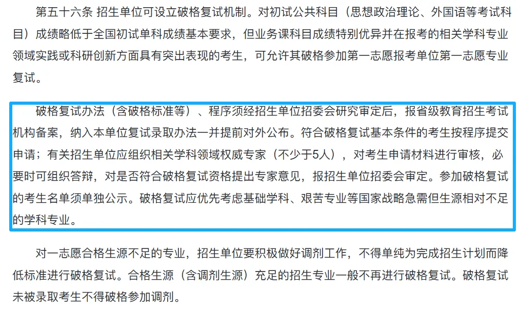 破格复试应优先考虑基础学科、艰苦专业等国家战略急需但生源相对不足的学科专业。