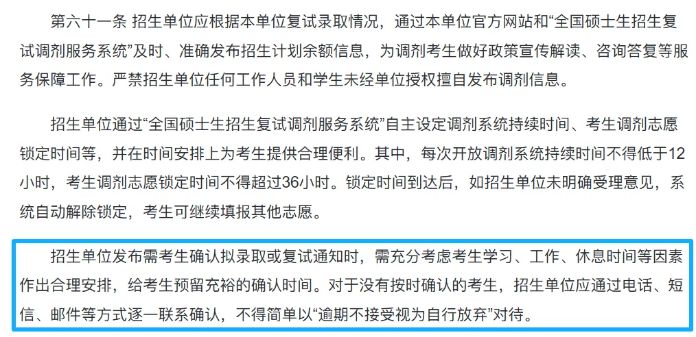 新规在调剂环节优化了流程并强调了人文关怀。要求招生单位发布需考生确认的拟录取或复试通知时,需充分考虑考生学习、工作、休息时间等因素作出合理安排,给考生预留充裕的确认时间。