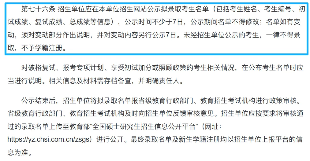 拟录取名单公示需包含考生姓名、考生编号、初试成绩、复试成绩、总成绩等关键信息,公示时间不少于7日,且公示期间名单不得修改。如有变动,须对变动部分作出说明并另行公示7日。这种全程可追溯的监督机制,提高了整个招生过程的透明度。