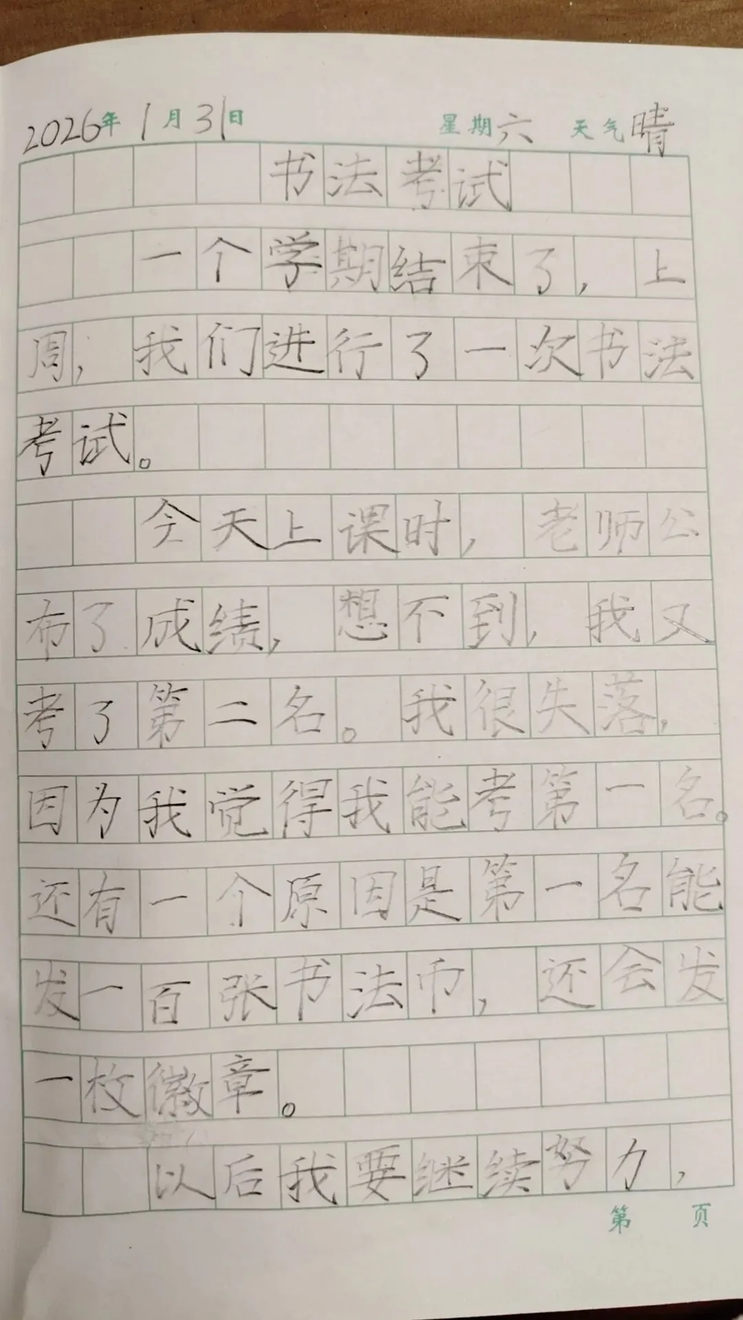 2026年1月31日 星期 六 天气晴 书法考试 一个学期结束了, 上周,我们进行了一次书法考试。 今天上课时,老师公布了成绩, 想不到,我又考了第二名。我很失落,因为我觉得我能考第一名。还有一个原因是第一名能发一百张书法币, 还会发一枚徽章。 以后我要继续努力,争取拿到第一!