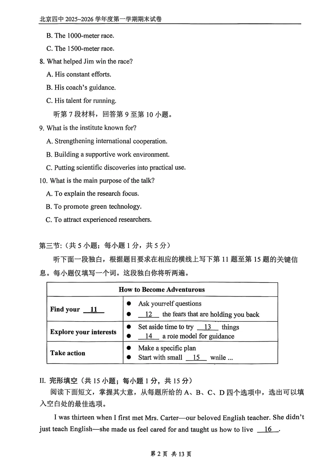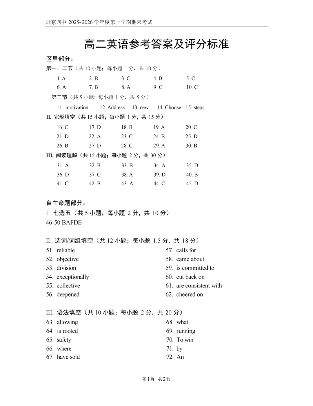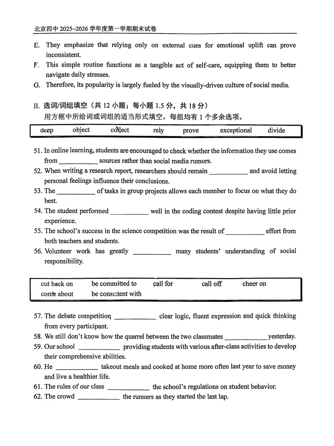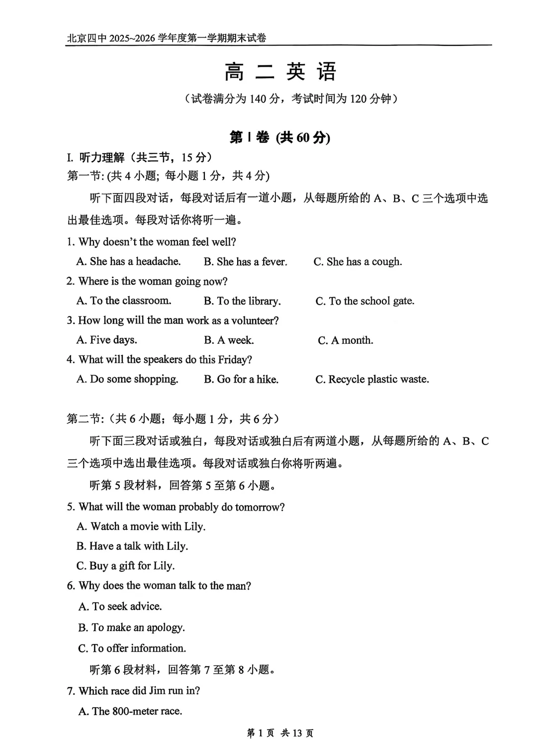 2026年北京四中高二期末考试于近日开考,英语、物理、化学、地理试题及答案出炉,为方便考生练习,特汇总整理了2026年北京四中高二期末考试试题及答案,持续更新中,一起来看!