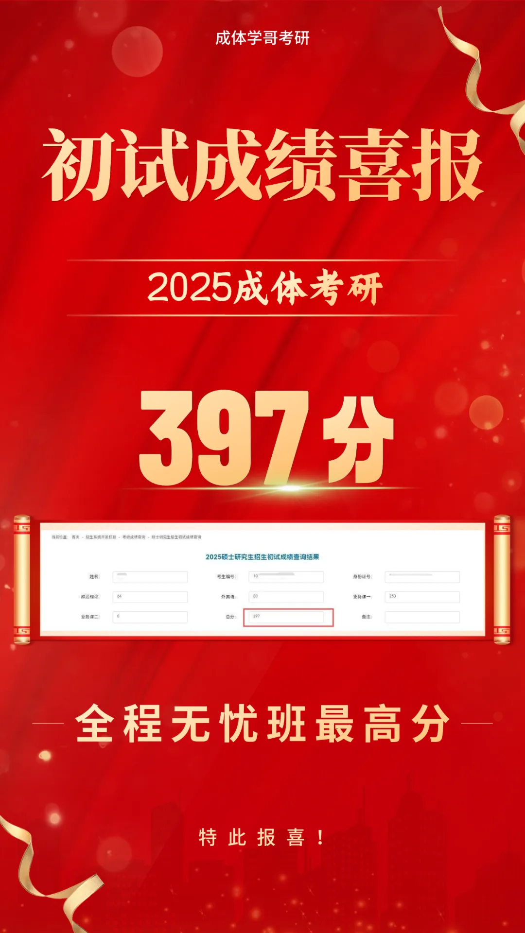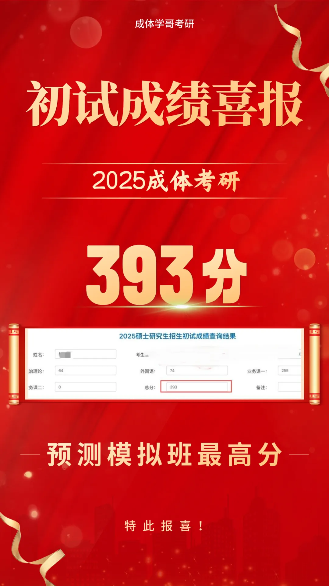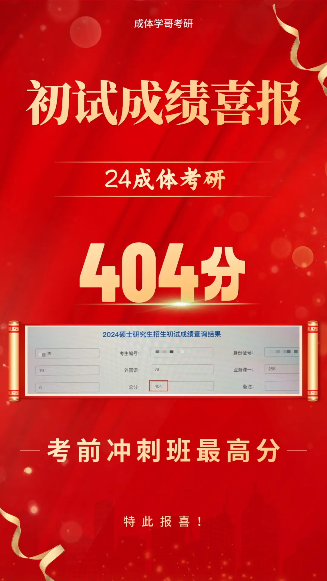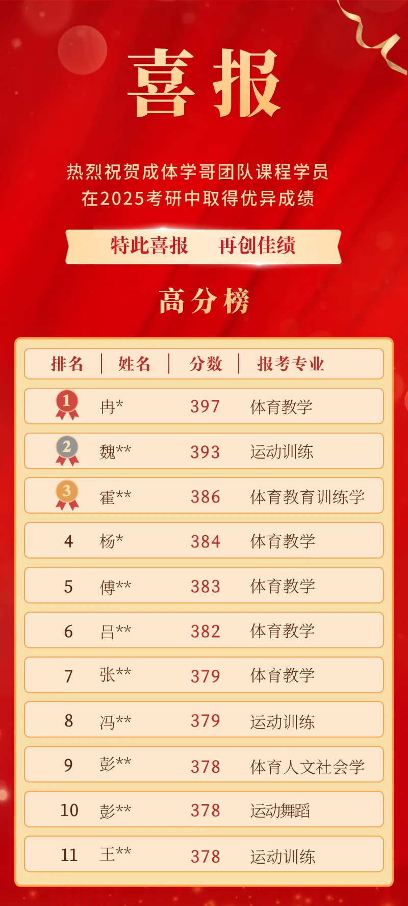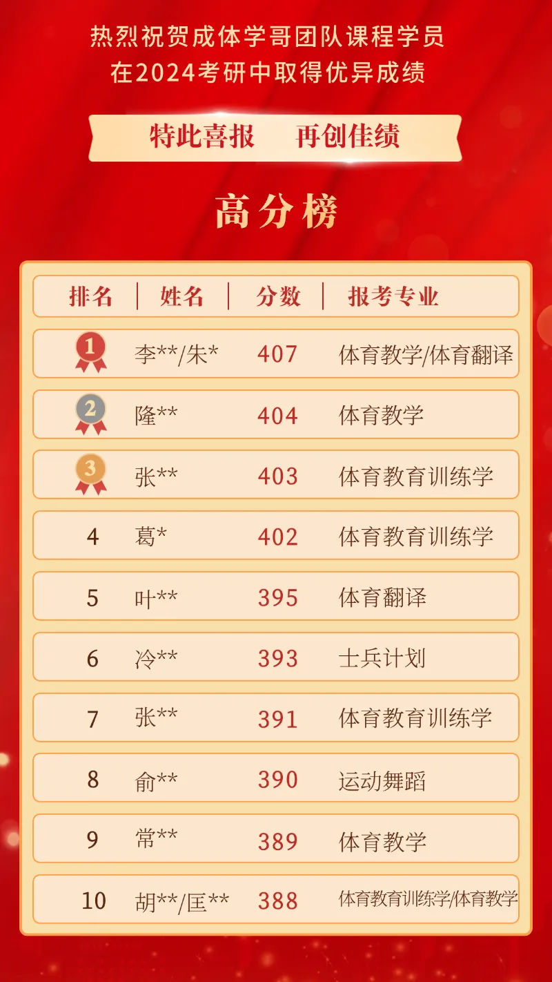 2、根据成体学哥团队的内部统计,全程班学员整体录取比例约为60%,譬如2025年最高分397分,2024年最高分407分,2023年最高分407分,2022年最高分408分,2021年最高分398分,最低分283分都为成体学哥团队全程班学员,同样的课程分数差距之大,同时近几年成都体育学院考研试题更为灵活多变,因此考研上岸是有多种影响因素的,我们并不能做到百分之百的上岸率;