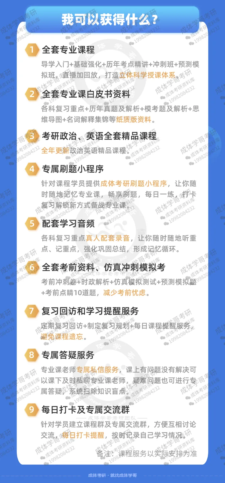 1、首先,这里要强调的是,在之前的第2、4条中已经明确提到,我们成体学哥团队是专注于提供专业课辅导服务。如果你是全程班的学员,我们将免费赠送政治和英语网课,帮助您进行系统性的学习。如果学弟学妹已经通过网络了解过相关情况,就会知道考研界有很多优秀的政治和英语老师可供选择。大部分考研的学生会根据自己的喜好选择合适的老师来辅助复习。因此,我们通常会让学员自行选择他们喜欢的老师进行跟课学习。