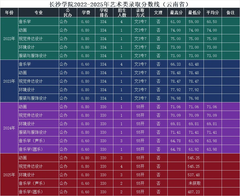 长沙学院艺术类招生专业有广播电视编导、播音与主持艺术、影视摄影与制作、动画、服装与服饰设计、环境设计、视觉传达设计、舞蹈学、音乐学等专业。近年来在云南省招生专业及录取分数线如下:
