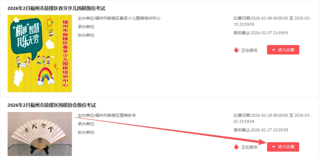 三、组别2级组:2级升1级5级组:5级升2级10级组:10级升5级15级组:15级升10级20级组:20级升15级25级组:25级升20级定级组:无级定25级四、报名方式报名时间内电脑登录:福建省围棋协会管理云平台http://match.fjswqxh.com,报名缴费后获得8位数字为准考证号(“个人中心”-“我的比赛”-“线上考级详情”中也可查看)。五、办法及标准使用电脑登录:福建省围棋协会管理云平台http://match.fjswqxh.com主页下载“考级软件”并安装(电脑配置最低要求:cpu i3 4代以上、4G内存以上、win7系统以上、屏幕分辨率1366× 768 以上,下载安装过程请关闭安全软件,避免误报误拦截,部分电脑安装后打开显示不正常,更新显卡驱动即可),在考试时间内凭准考证号登录程序进行。六、考试内容考试有2次机会,内容如下:定级组:20道死活题+5局人工智能对弈,10路吃子,先吃3子为胜,胜2局结束。考试时间40分钟。25级组:20道死活题+5局人工智能对弈,12路吃子,先吃5子为胜,胜2局结束。考试时间50分钟。20级组:20道死活题+3局19路人工智能对弈,胜1局结束。考试时间85分钟。15级组:20道死活题+3局19路人工智能对弈,胜1局结束。考试时间90分钟。10级组:20道死活题+3局19路人工智能对弈,胜1局结束。考试时间115分钟。5级组、2级组:20道死活题+3局19路人工智能对弈,胜2局结束。考试时间160分钟。19路对弈均为执黑贴3又3/4子,由系统判断终局并启动数子判定胜负。满分100分,定级组70分以上为通过;25级、20级、15级、10级组、5级组、2级组90分以上为通过。七、有关事项1、线上考试必须使用电脑联网进行,不得越级报名;2、服务费150元(微信支付),报名截止前,选手可以自由退赛,费用原路返回。报名截止后不可退赛退费;3、每道死活题有一遍语音说明题目要求,请家长陪伴学龄前儿童考试,确保电脑扬声器打开并且音量正常;4、考试过程中如果网络中断,考试不受影响,可进行到结束,在提示后可以退出程序;待网络正常后,打开程序会自动上传成绩;在考试过程中右上角关闭退出将进行当前分数结算;如果采用结束程序或者强行关机的方法,本次判为未通过(如遇问题请及时保留截图咨询);5、请保管好准考证号,防止泄漏,同一个准考证号在不同设备同时登录进行考试成绩无效,并锁定账号,需联系客服解决;6、未在福建省围棋协会管理云平台上注册的请先注册再报名(注册方法见平台首页上方的“帮助文档”)。注册后务必将资料填写完整(参赛者信息),重点检查姓名、性别、出生年月、身份证号、1寸证件照电子版、棋力等;选择“2026年2月福州市鼓楼区围棋协会级位考试”进行报名。7、通过后级位证书将由福建省围棋协会统一审核并打印,考生可询问联系人领取;8、报名联系人:徐老师、黄老师联系电话:15960177240、18050166229。