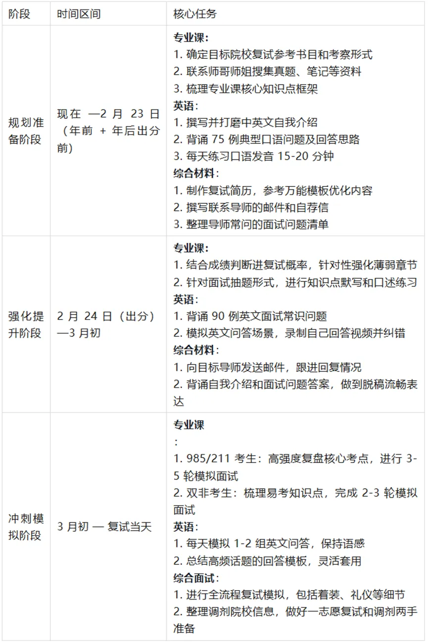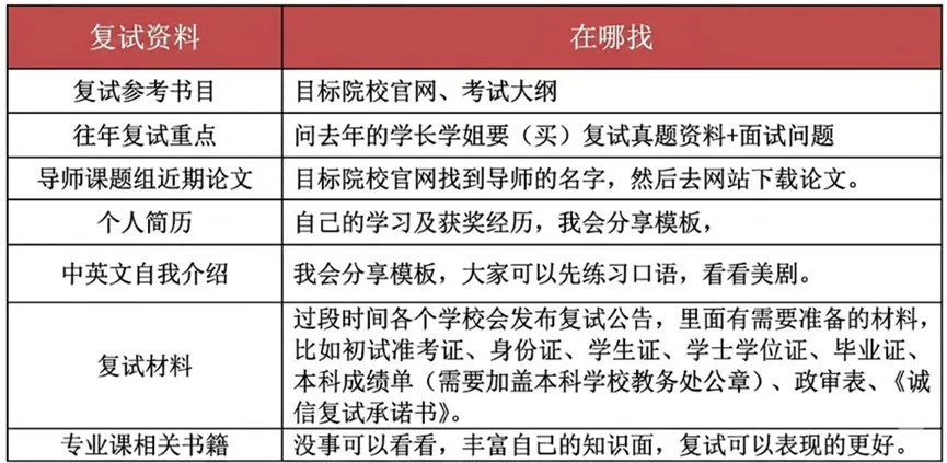 总结下来,年前要做的事情有:①查看复试大纲、收集往年复试真题、专业课面试问答题目;②准备复试简历、自荐邮件;③撰写并打磨中英文自我介绍。