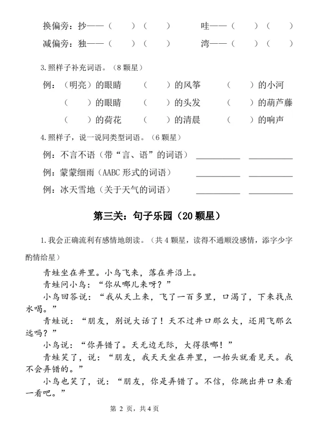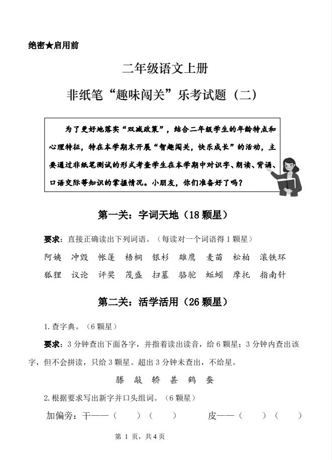 二年级语文上册非纸笔考试“趣味闯关”乐考试题