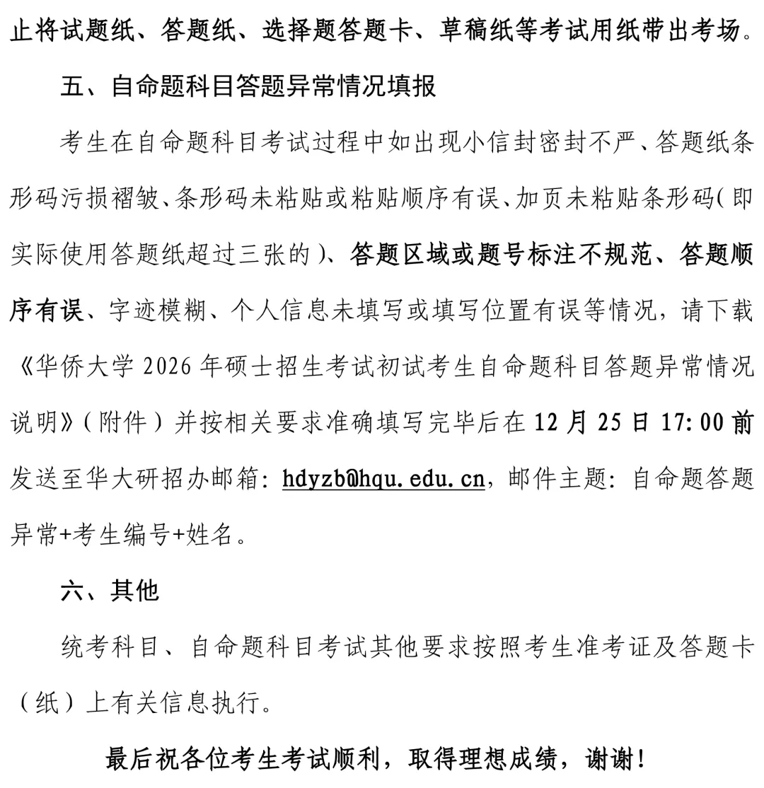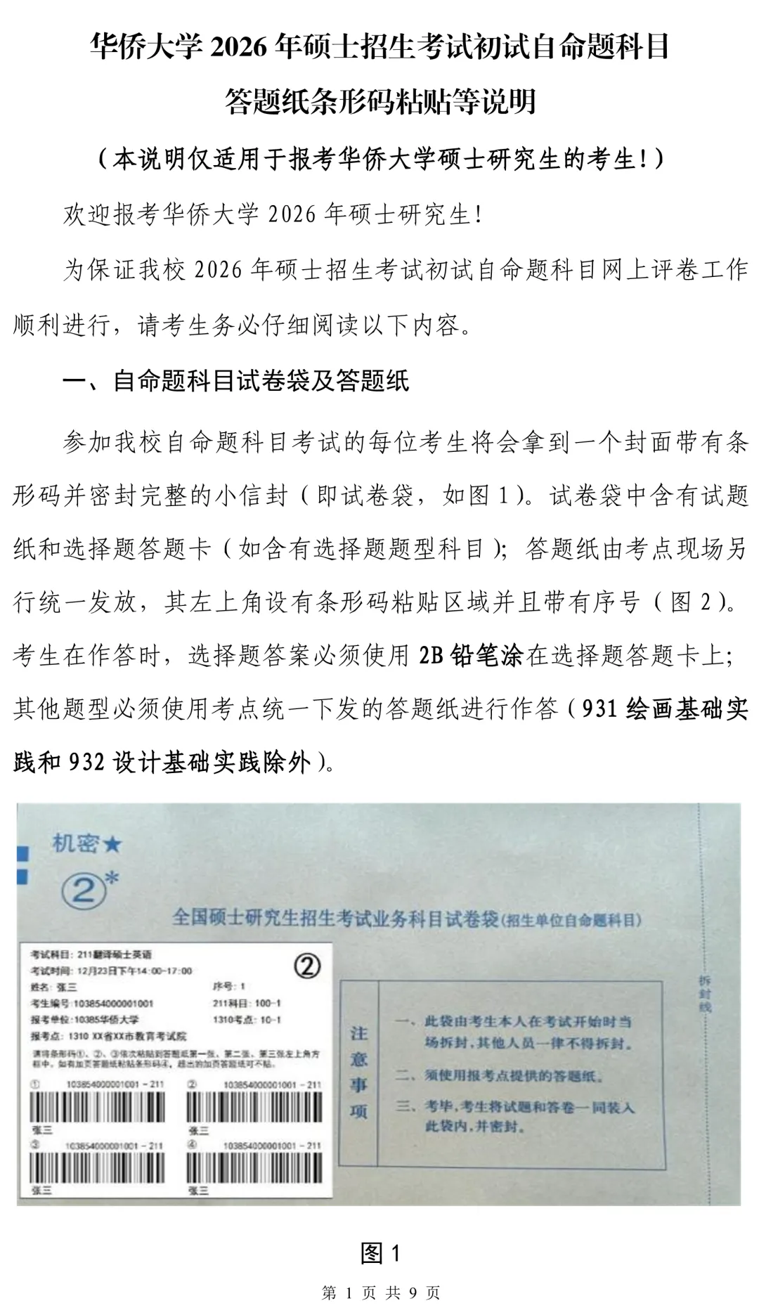 我校2026年硕士研究生招生考试(初试)自命题科目采取网上评卷,为做好评卷相关工作,请考生务必认真阅读《华侨大学2026年硕士招生考试初试自命题科目答题纸条形码粘贴等说明》。