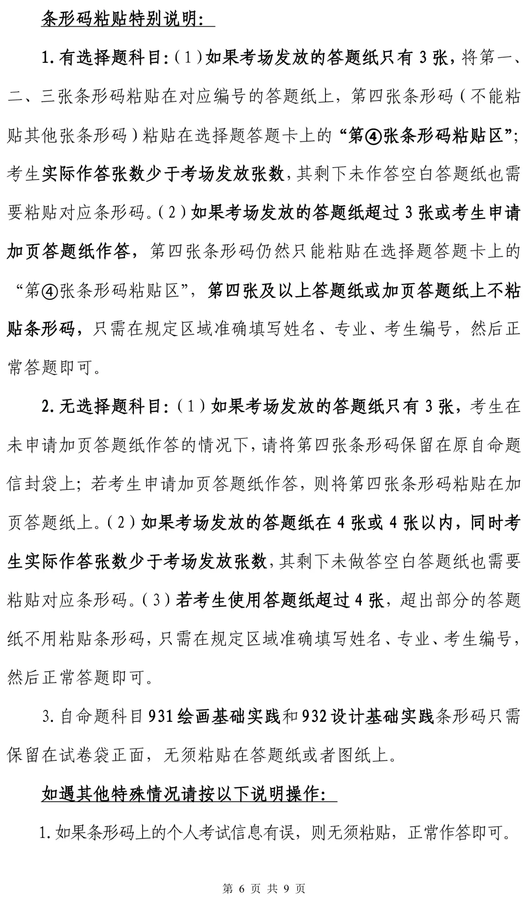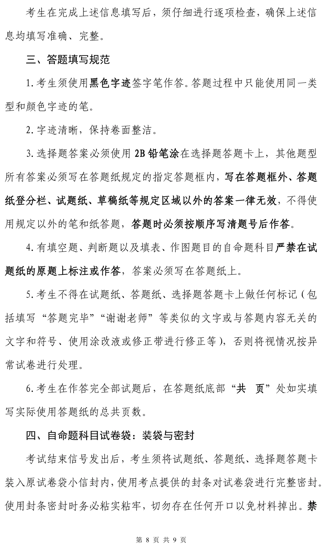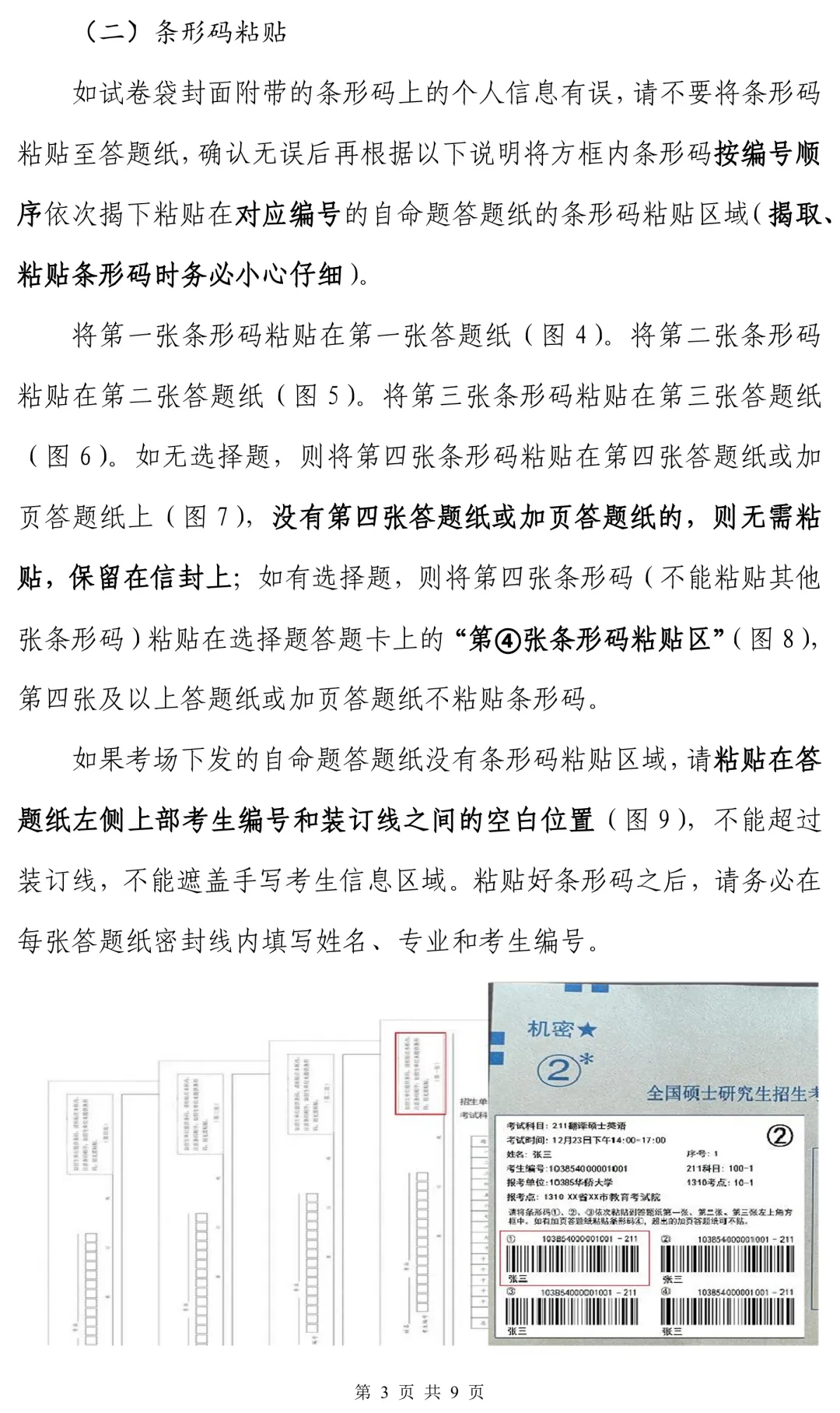 2026年,条形码粘贴与往年最大区别:有选择题科目,选择题答案必须使用2B铅笔涂在选择题答题卡上,第四张条形码(不能粘贴其他张条形码)粘贴在选择题答题卡上的“第④张条形码粘贴区”;第四张及以上答题纸或加页答题纸上不粘贴条形码,只需在规定区域准确填写姓名、专业、考生编号,然后正常答题即可。