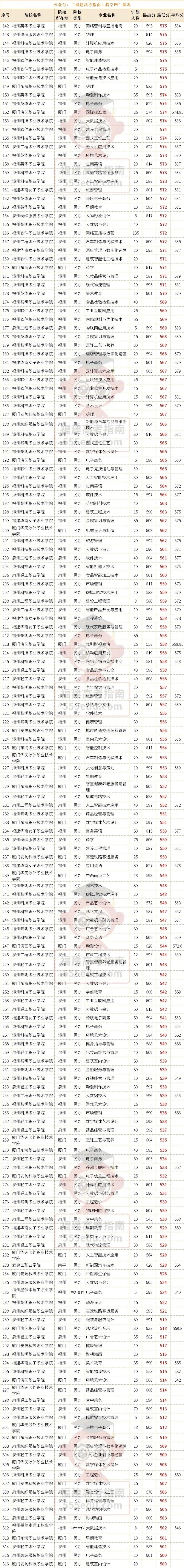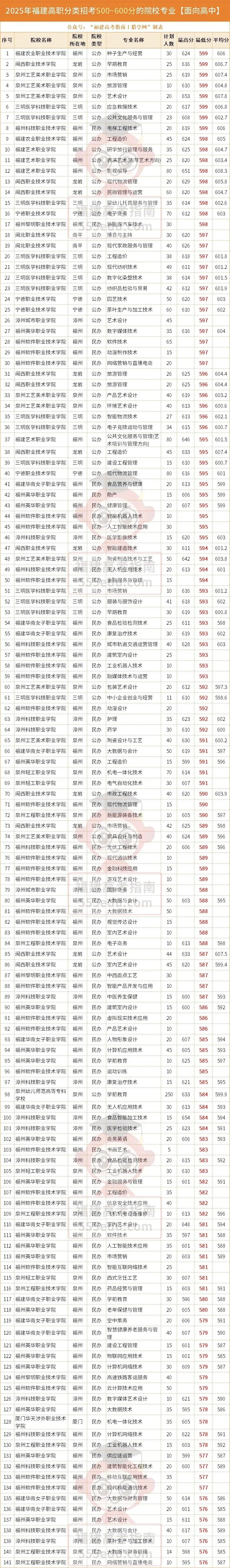 ·公办院校最低录取分数线为584分,对应院校为泉州幼儿师范高等专科学校;