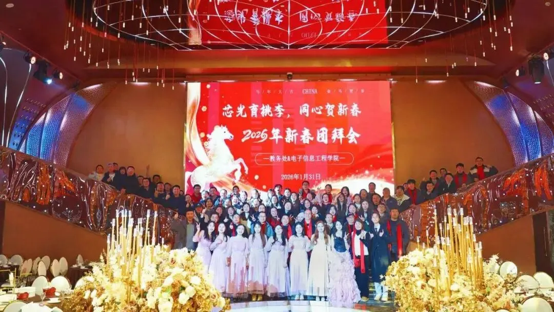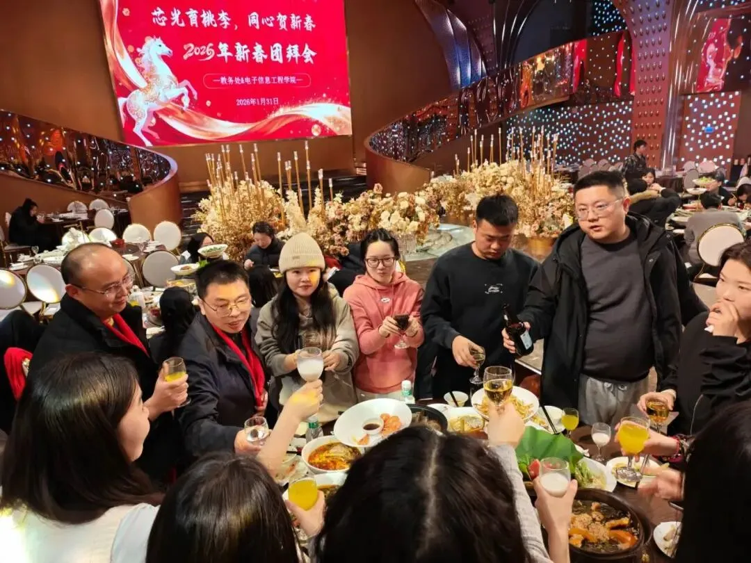 为凝聚育人合力、营造喜庆祥和的节日氛围,展现教师队伍团结协作、积极进取的精神风貌,激励全体教育工作者以更饱满的热情投身新一年教育教学事业,2026 年 1 月 31 日晚,教务处与电子信息工程学院于施华诺雅艺术宴会酒店联合举办以 “芯光育桃李,同心贺新春” 为主题的新春团拜会。两部门全体教师欢聚一堂,共话过往成就,共迎新春佳节。