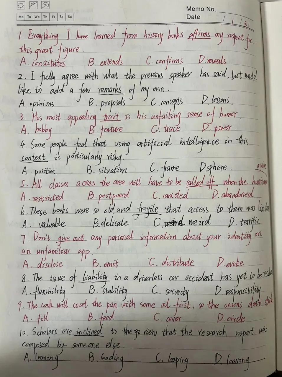 一个星期过去了,还是在做一页题抄一页单词的拉扯中。有好转的情况是上午有空也会拿起笔了,在抄写单词的时候能想起可能相似的单词来。