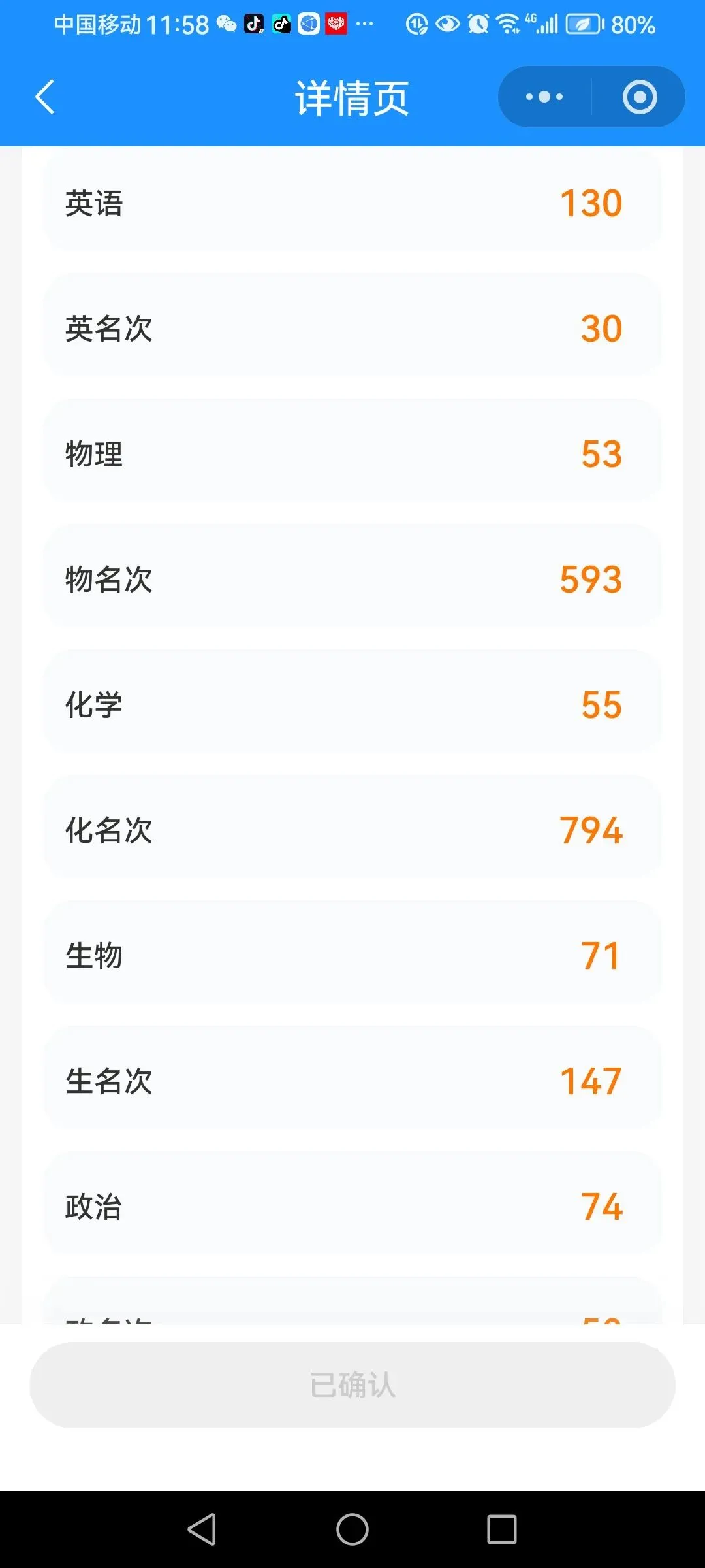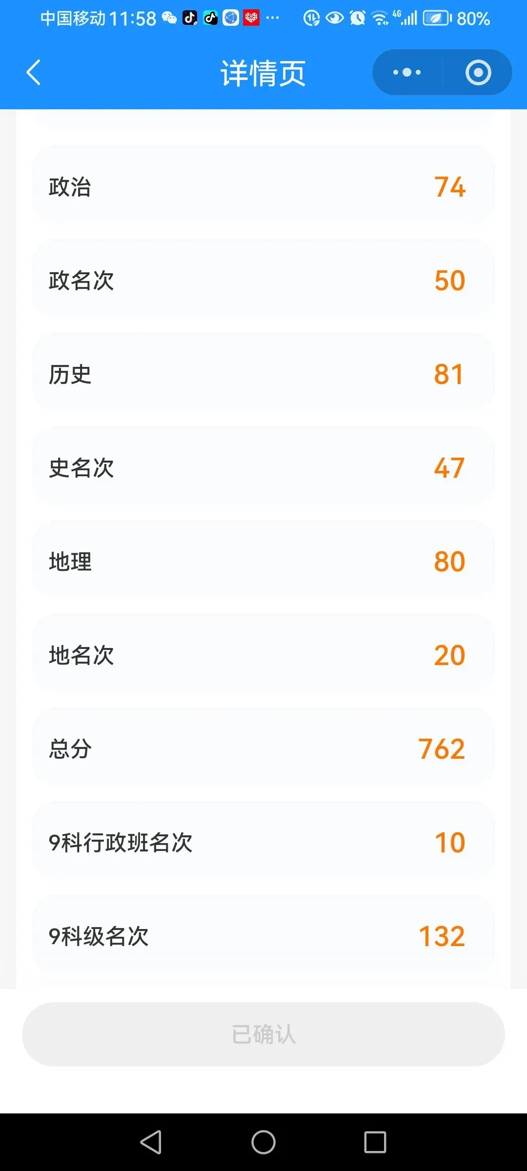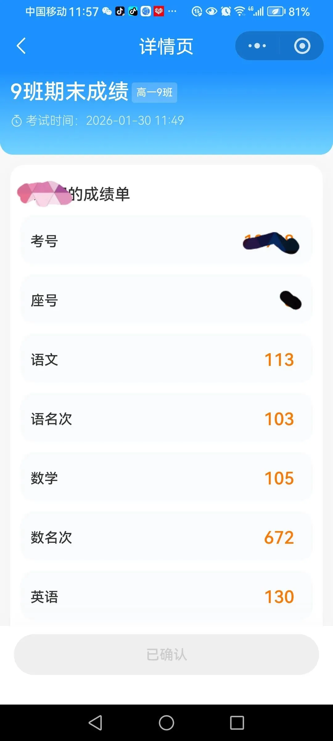 随着“叮咚〞信息提示声音,打开一看,原来孩子的班主任发信息过来啦,是孩子的期末考试成绩单。