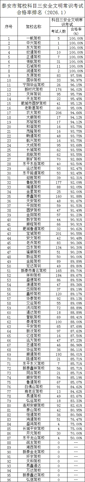 泰安市驾校科目三安全文明常识考试合格率排名(2026.1)