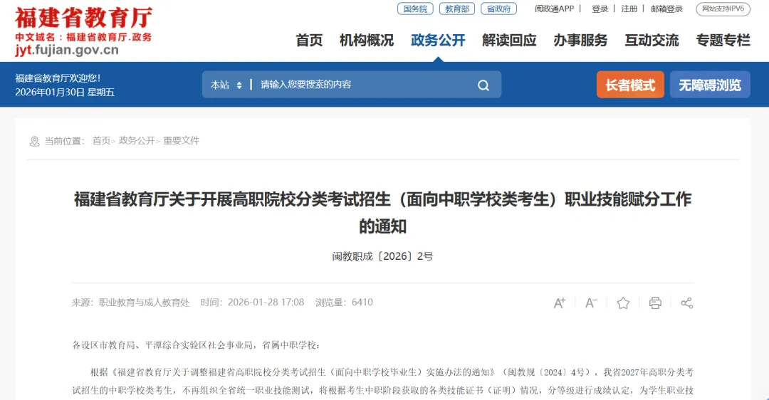 根据《福建省教育厅关于调整福建省高职院校分类考试招生(面向中职学校毕业生)实施办法的通知》(闽教规〔2024〕4号),我省2027年高职分类考试招生的中职学校类考生,不再组织全省统一职业技能测试,将根据考生中职阶段获取的各类技能证书(证明)情况,分等级进行成绩认定,为学生职业技能赋分。为有序开展高职院校分类考试招生(面向中职学校类考生)职业技能赋分工作,确保过程严谨、公正、公开,现将有关要求通知如下。