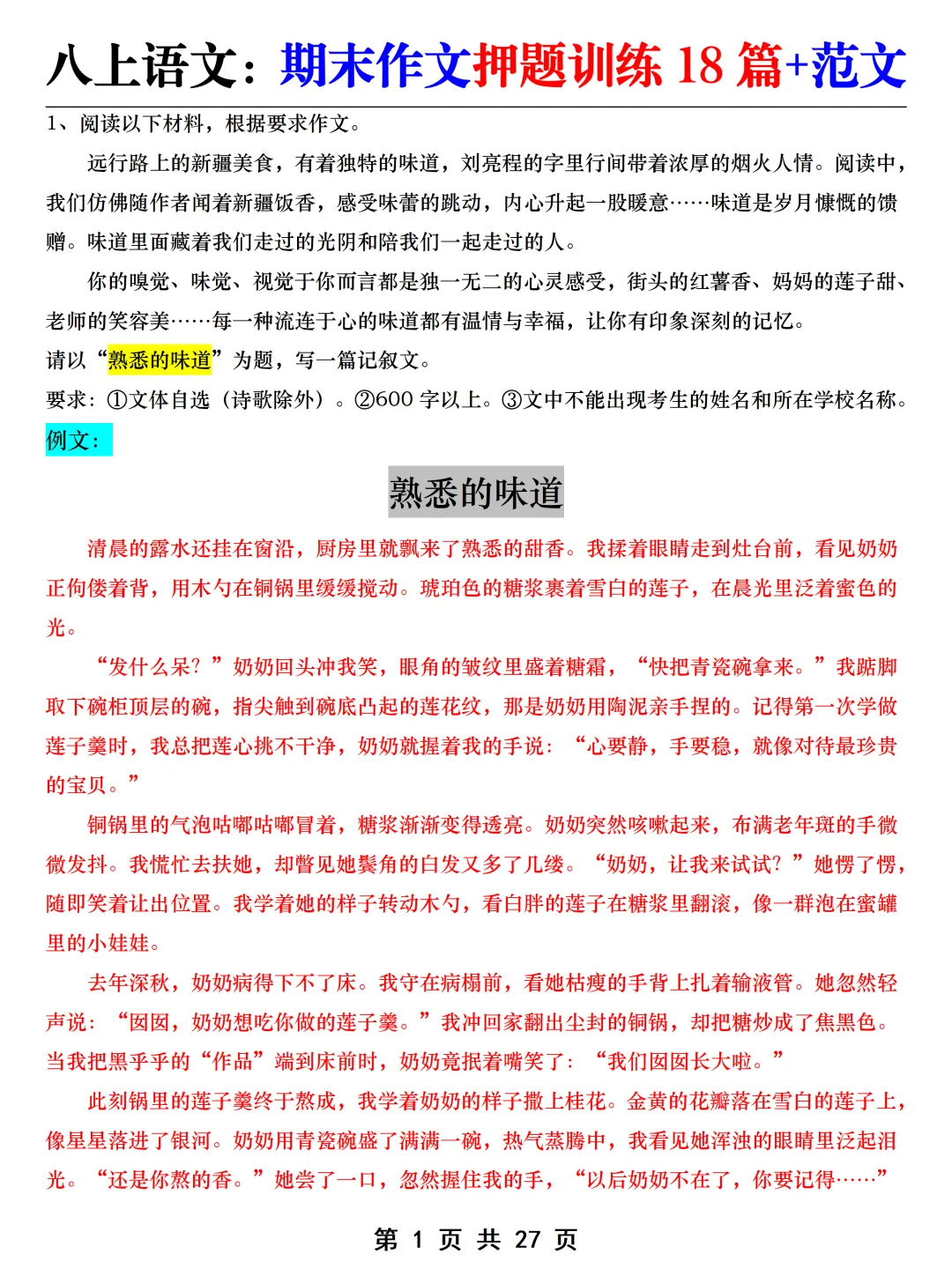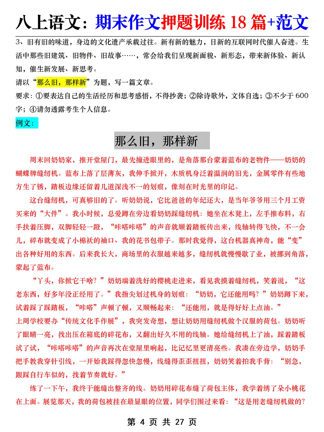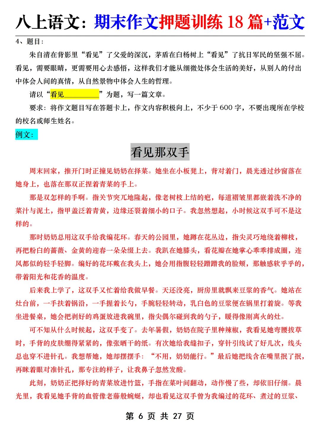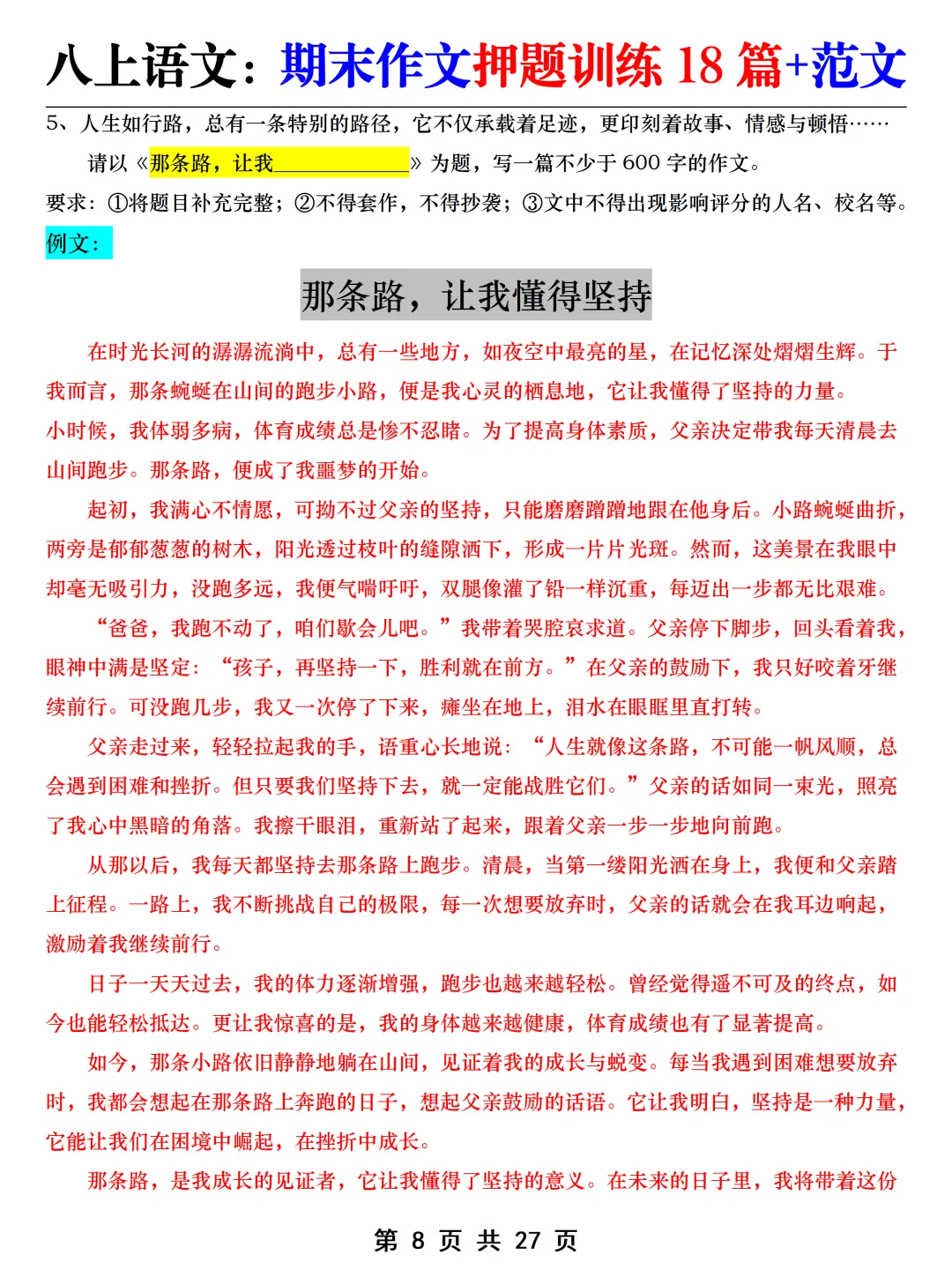 针对有此疑虑的同学,老师给大家整理了八上语文【期末作文押题训练18篇+范文】,都是结合最新教材版本重新整理汇总的,考前练一练,考试稳拿高分!