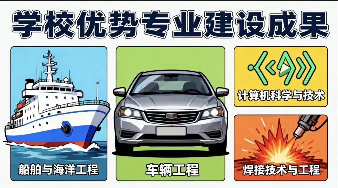 · 优势专业推荐:根据在校生实名推荐,船舶与海洋工程、车辆工程、计算机科学与技术、焊接技术与工程、机械设计制造及其自动化 等专业备受认可。其中,船舶与海洋工程、车辆工程 是国家级一流本科专业建设点。