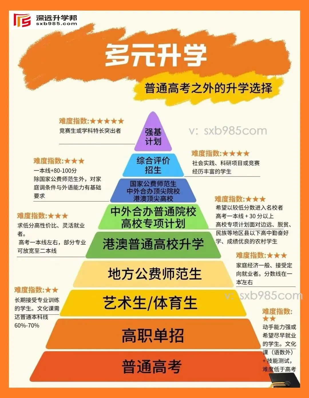 📌 最后想说 这张金字塔图不是让你盲目跟风,而是提醒我们:升学规划要趁早。高一高二发现孩子的特长和兴趣,比高三临时抱佛脚有用得多。 成绩拔尖的可以冲击强基和综评,中等生可以关注专项计划和中外合办,有技能特长的不妨考虑高职单招。 与其在千军万马中挤高考独木桥,不如提前布局,找到最适合孩子的那条路。 --- 要不要我帮你整理一份**多元升学路径规划清单**,把每种路径的关键时间节点和准备要点都列出来,让你按年级一步步规划?