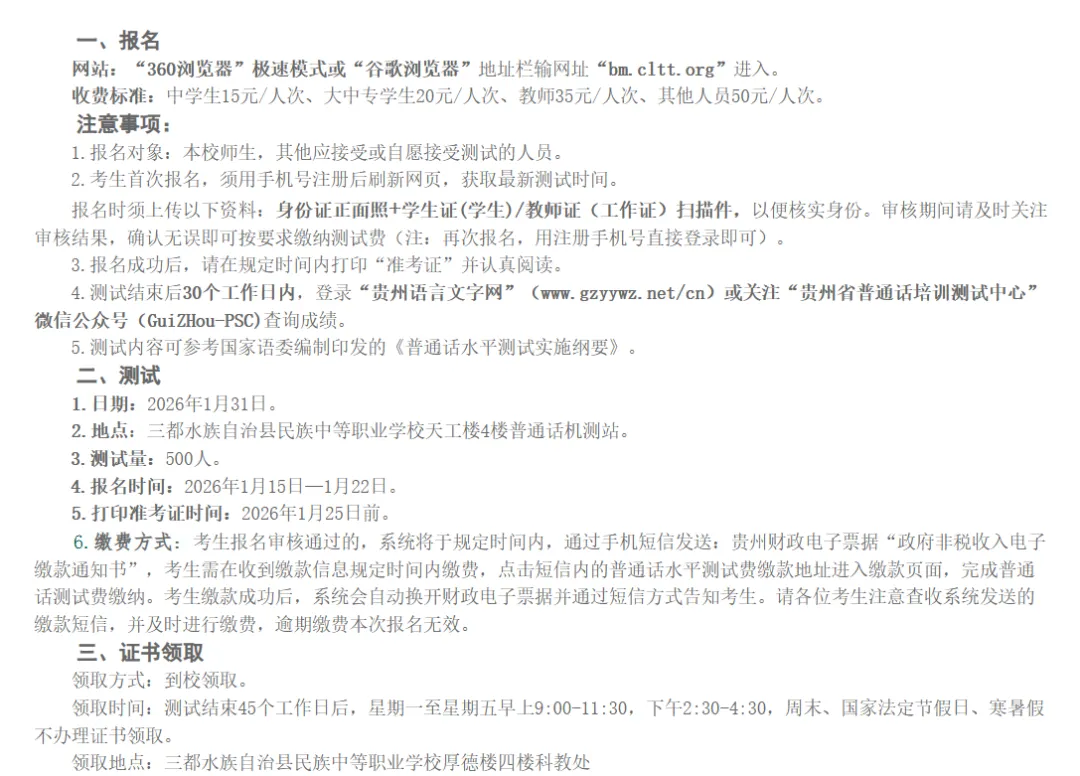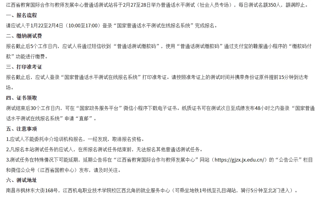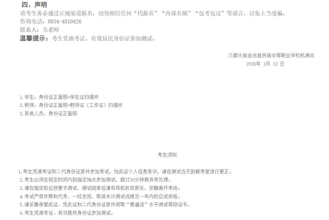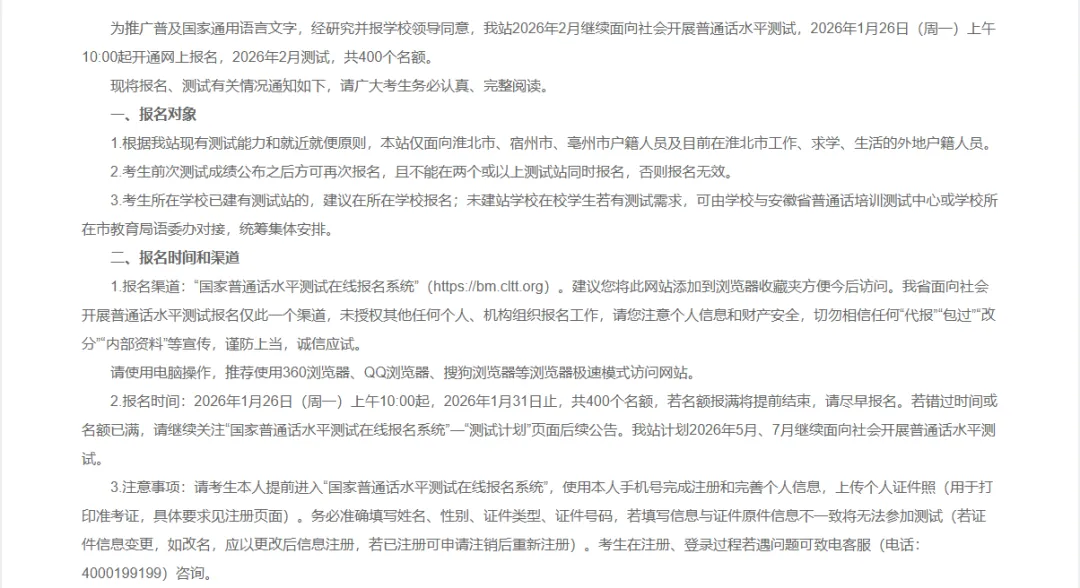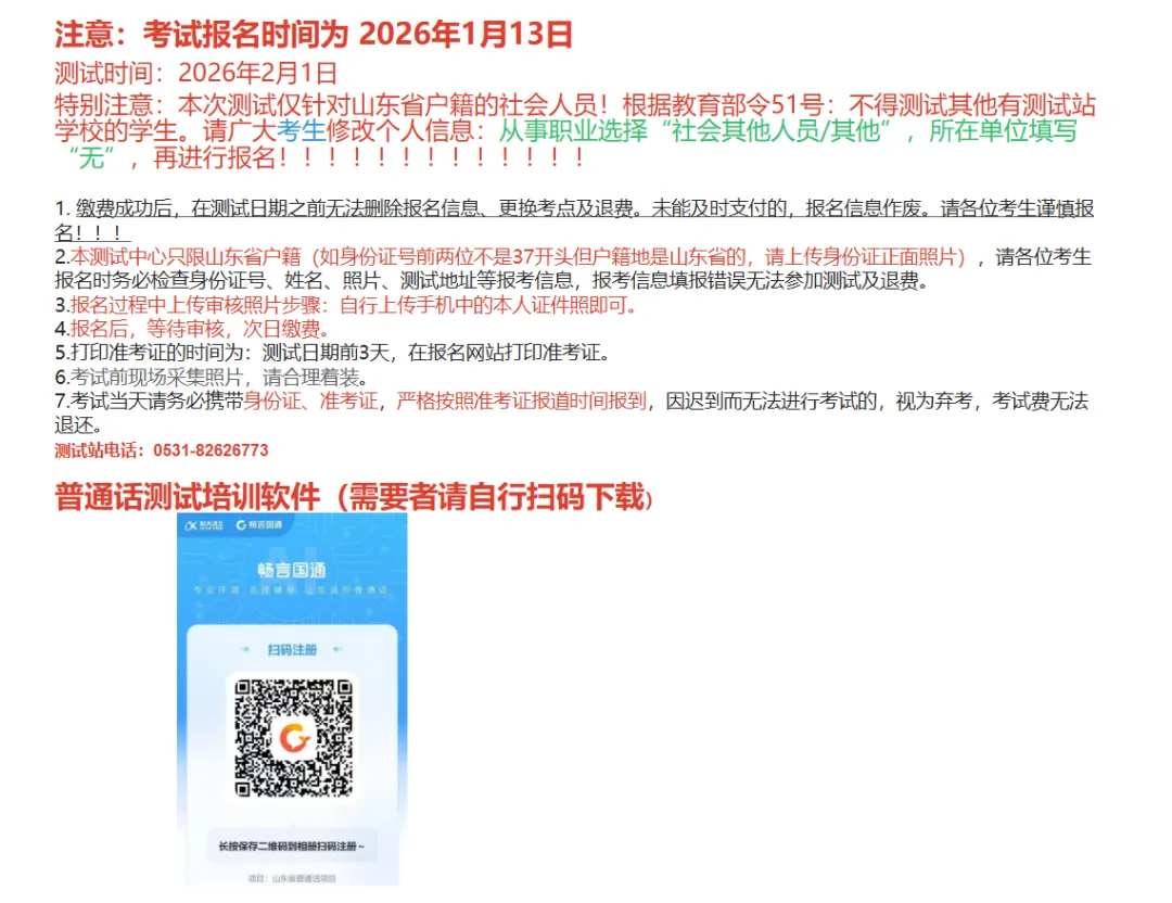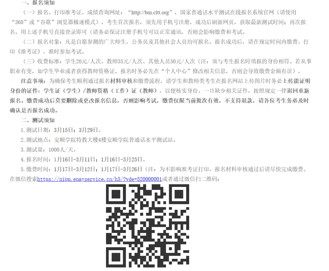 注意事项:普通话考试报名不存在与任何社会机构或个人合作代报,请考生本人按所报测试站的“报名须知”自行报名、缴费,不要委托机构或他人代理报名缴费。