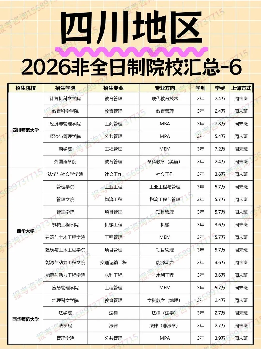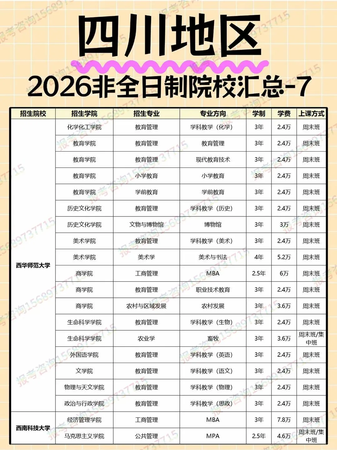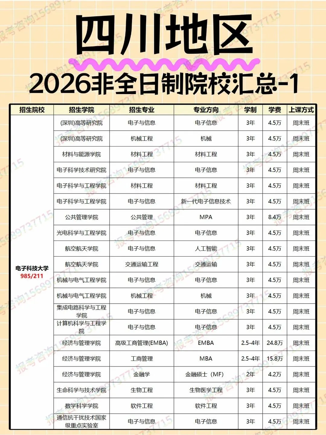 - 上课方式灵活:电子科技大学、西南交通大学、四川农业大学等提供集中班,适合跨城通勤考生;其他院校以周末班为主