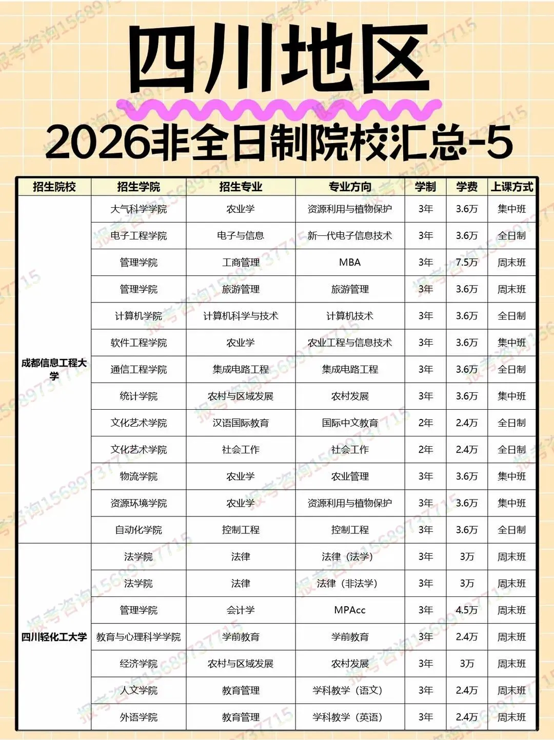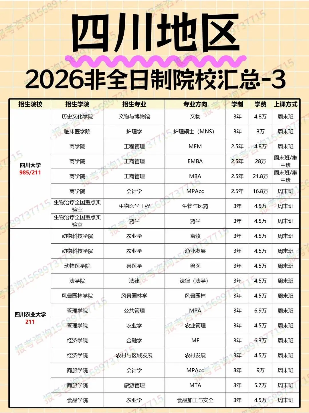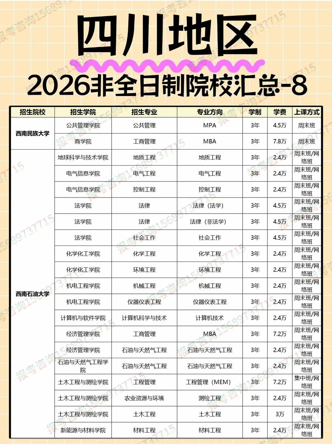 - 上课方式灵活:电子科技大学、西南交通大学、四川农业大学等提供集中班,适合跨城通勤考生;其他院校以周末班为主