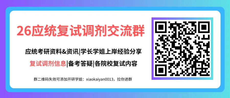 群聊二维码失效、资讯资料、复试咨询等问题添加开研学姐xiaokaiyan0013,学姐可以耐心答疑哦,你的名字这么好听一定会出现在录取通知书上!!