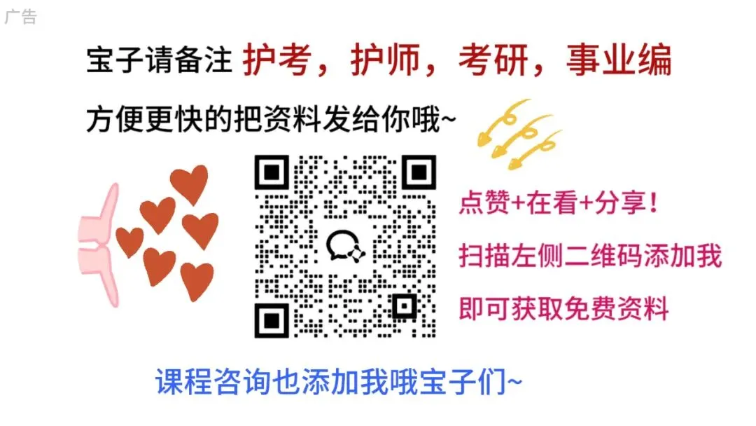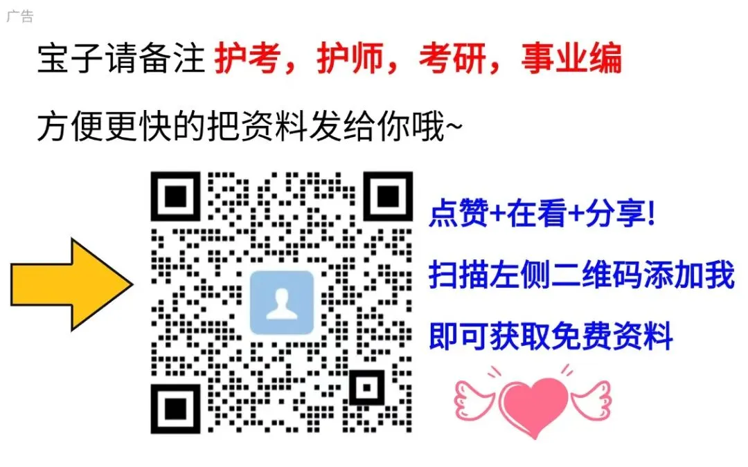 为助你高效通关,现免费分享护考核心精华资料:最新高频考点总结、历年真题解析及实用记忆口诀。 扫描下方二维码即可免费领取资料!!!把握关键,轻松备考!