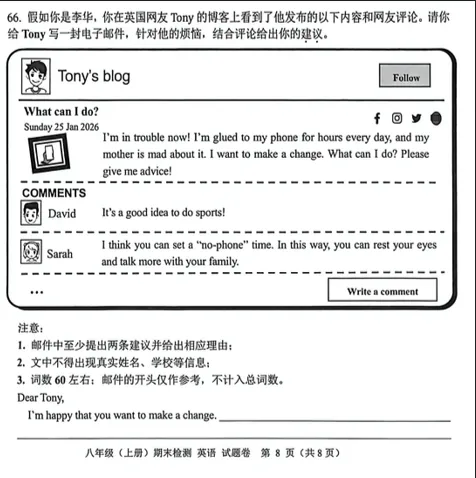 本次八年级上册期末考试于1月30日落下帷幕,这次的英语作文(图1)以博客留言的生活化场景切入,要求学生以李华的身份给英国网友 Tony 写一封电子邮件,针对其 “沉迷手机、想做出改变” 的烦恼给出具体建议。这一命题紧扣单元主题 “Digital life”,聚焦数字时代青少年的真实困境,既考查语言表达能力,也引导学生理性看待数字设备的使用。
