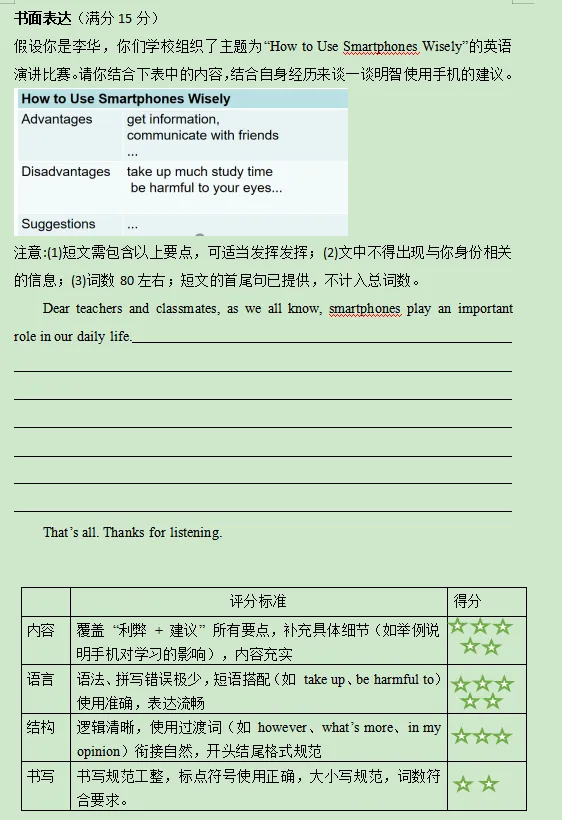 考试前练习的“How to Use Smartphones Wisely”演讲题(图2),新外研版八年级期末书面表达复习与本次考试作文虽形式不同,但核心主题高度契合,对学生完成考试作文起到了显著的辅助作用。