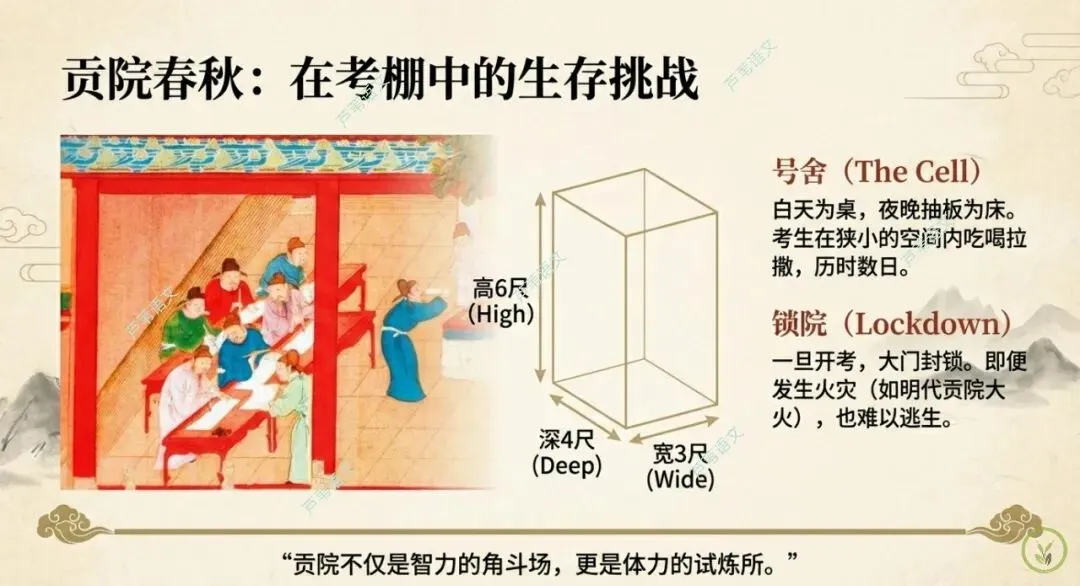 - 锁院制度:考官与考生一同锁死在贡院内,甚至发生火灾也严禁开门(惨烈的公平代价)。